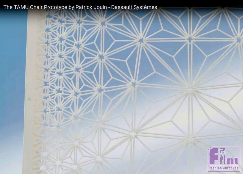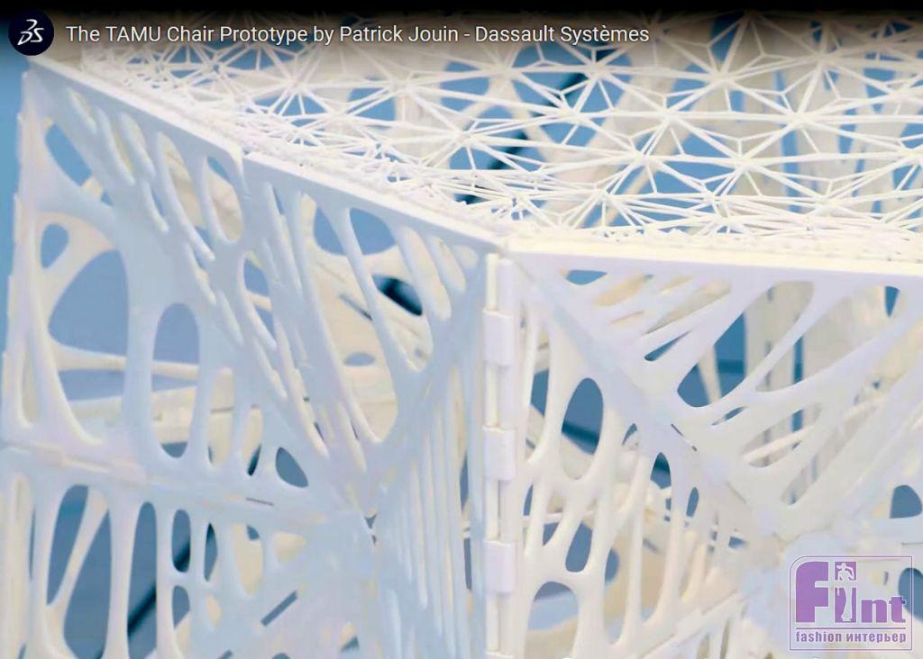 Французский дизайнер Патрик Жуэн представил во время Миланской недели дизайна прототип стула, изготовленный методом 3D-печати. TAMU Chair — полностью складывается, и спроектирован из наименьшего количества материалов. Дизайнер иллюстрирует тот факт, что дизайн сегодня всё больше и больше рассматривается с точки зрения эффективности и практичности. Каждый элемент складного стула дизайнера связан с другим, чтобы создать целостное и функциональное единое целое. Стул был показан в рамках инсталляции Dassault Systèmes.