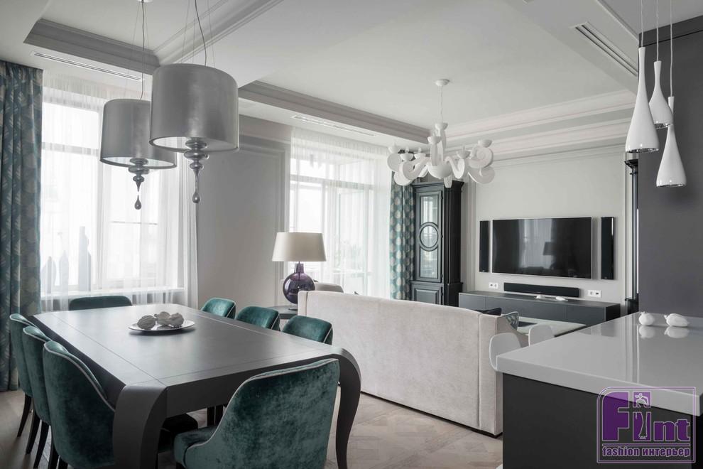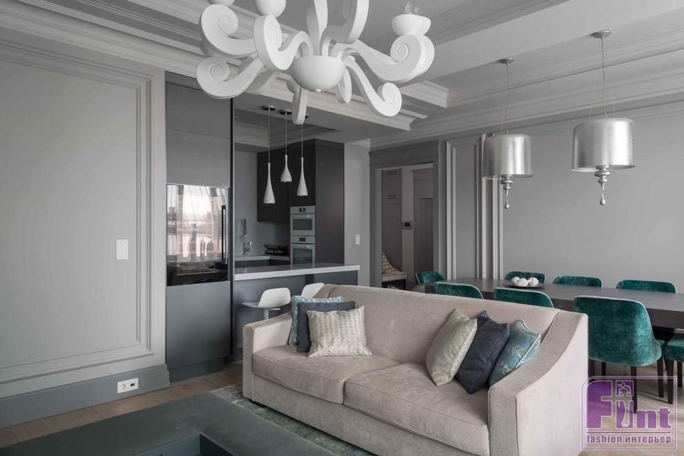 В целом интерьер оставляет очень благоприятное ощущение комфорта и уюта, благодаря умелому использованию спокойных оттенков и классических приёмов оформления жилого пространства. В интерьере учтены все пожелания заказчика и реализованы все замыслы автора. Несмотря на относительную монохромность «50-ти оттенков серого», Дмитрию Быкову удалось довольно деликатно обогатить дизайн интерьера яркими акцентами, будь то акцентная стена оранжевого цвета, керамические аксессуары глубокого лазурного оттенка или бирюзовый бархат на обивке мягкой мебели в зоне столовой.