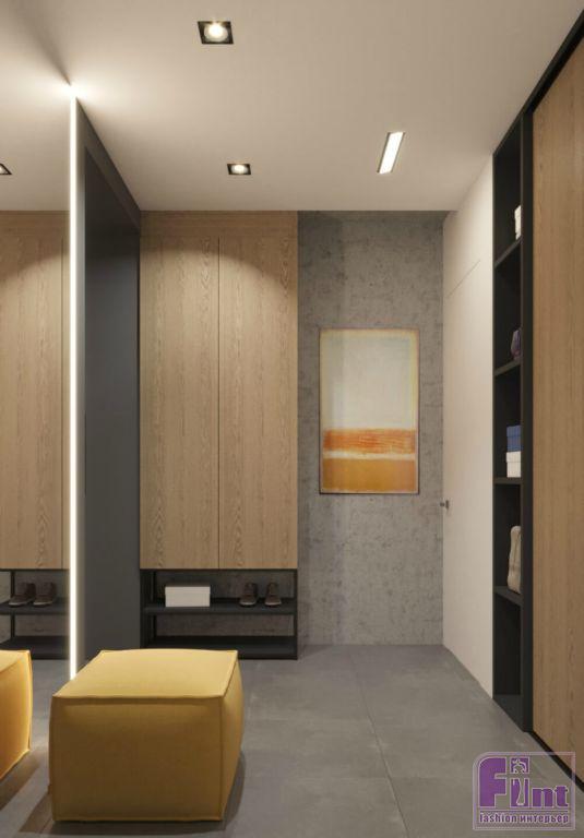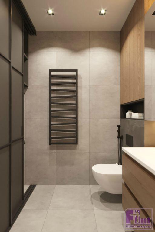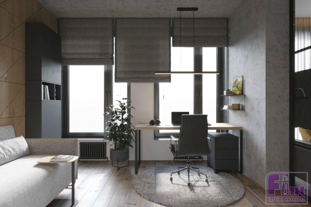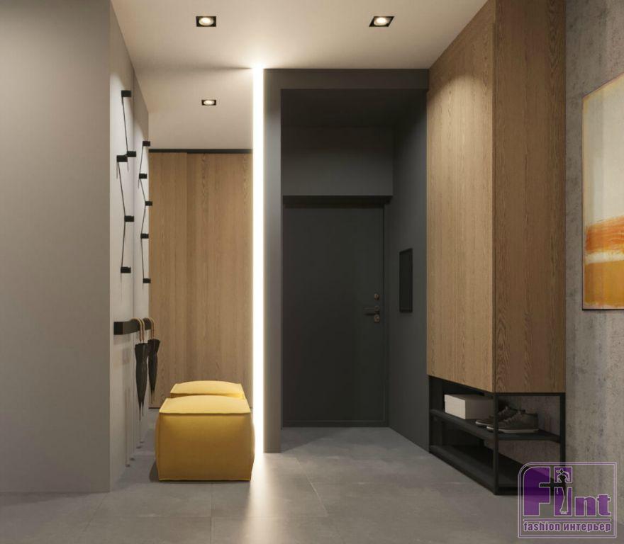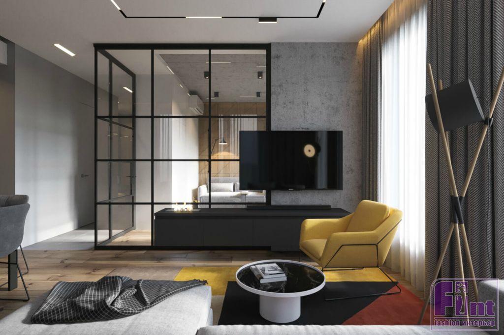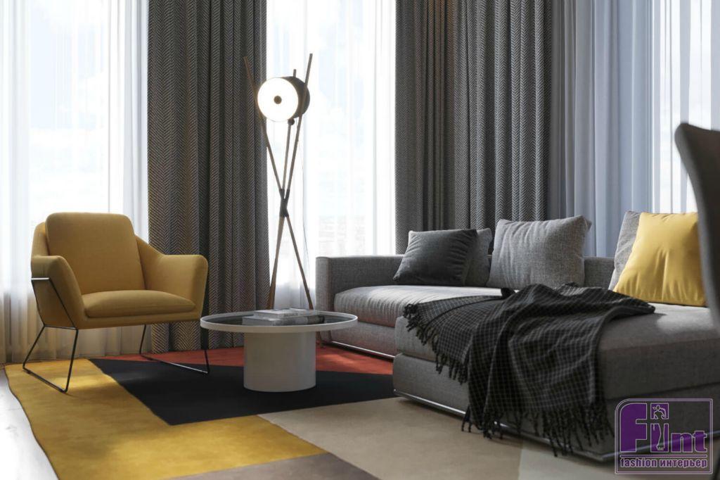 В отделке квартиры тёплые оттенки дерева эффектно сочетаются с холодом бетона, а точнее микроцемента, обладающего сходной текстурой. Большое внимание уделено серому цвету, что придает интерьеру благородную строгость. «За яркость здесь отвечают жёлтое кресло в гостиной и пуф в прихожей, — рассказывает Алексей. — Для того чтобы «разбавить» цветовую гамму, мы положили яркий ковер с геометрическими узорами».