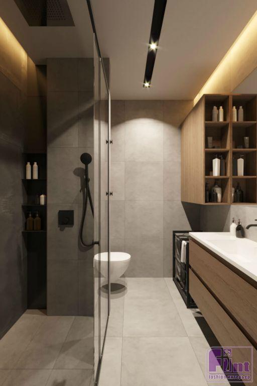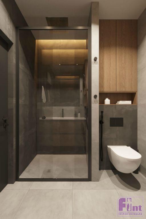 Разделяющая гостиную и кабинет перегородка со смарт-стеклом пропускает свет и делает помещение больше, но стоит нажать кнопку — и перегородка становится матовой, так что гости могут ночевать в кабинете. В коридоре и санузлах на полу положили керамогранит, а в комнатах — паркет.