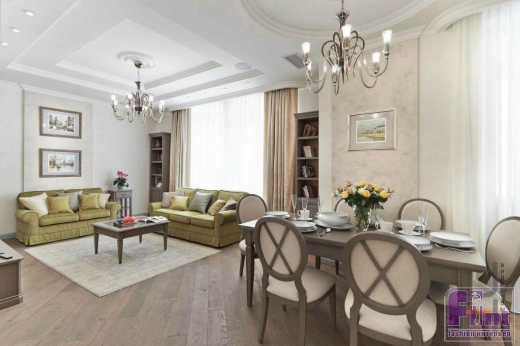 Относительно стиля интерьера никаких конкретных пожеланий у заказчиков не было. Задача заключалась в том, чтобы создать пространство спокойное, располагающее к отдыху и общению. Поэтому выбор пал на неоклассику с карнизами, молдингами, спокойными молочными оттенками стен и мебели, контрастирующими с ореховой паркетной доской. Не обошлось и без ярких пятен: в гостиной появилась мебельная группа теплого зеленого оттенка, а в спальне — лиловый текстиль.