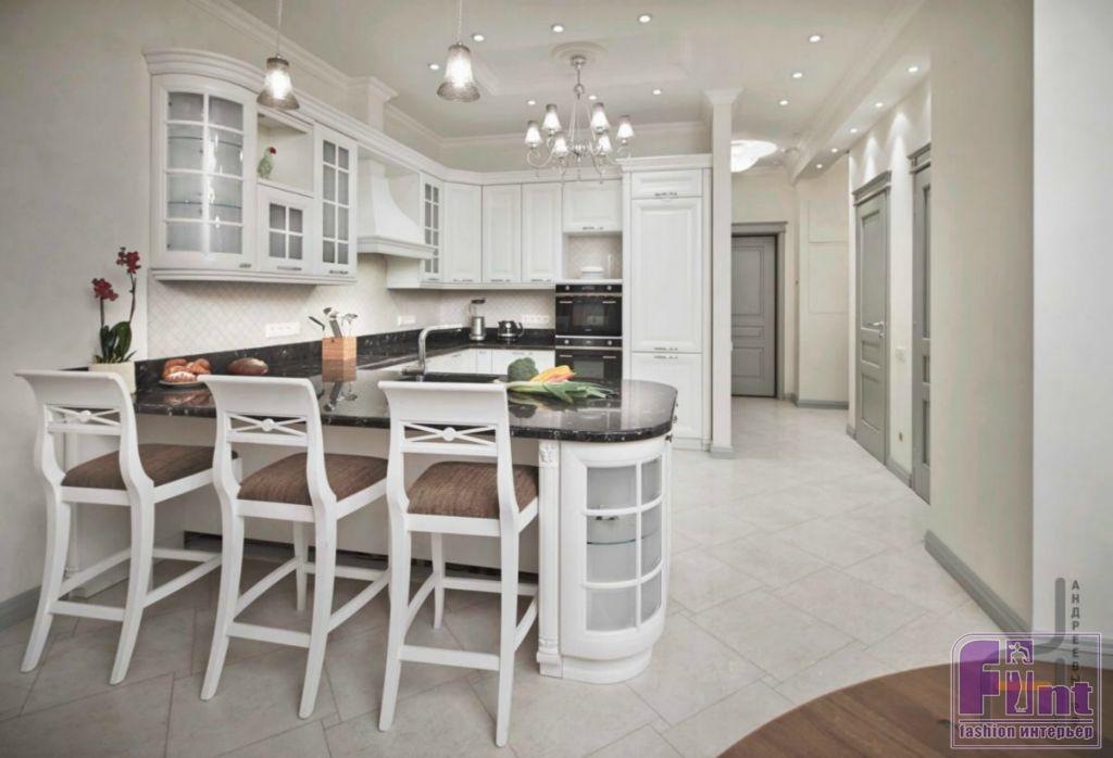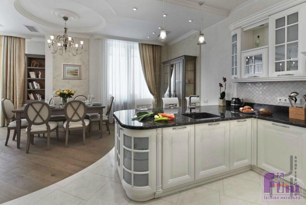 При отделке стен в цветовом решении дизайнеры применили светлые оттенки, полы контрастировали брашированой ореховой паркетной доской. Мебель кухни молочно-белого цвета с полуостровом, со встроенной витриной с подсветкой и барной стойкой также помогает сделать интерьер воздушным и лёгким.
