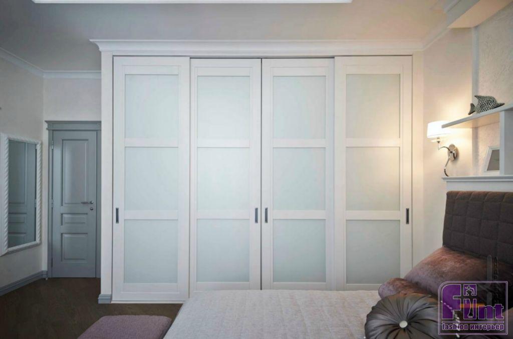 В спальной комнате хозяев квартиры дизайнеры спроектировали большой и очень вместительный встроенный шкаф с раздвижными дверями и матовыми стеклянными фасадами. Шкаф выполнен по индивидуальному проекту дизайнеров с учётом габаритов спальни. Высота помещений позволила применить эффектные трёхуровневые потолки со скрытой встроенной светодиодной подсветкой и лепной декор простых форм. Во всём интерьере используется вариантное освещение, придающее ему особый шарм и уют.
