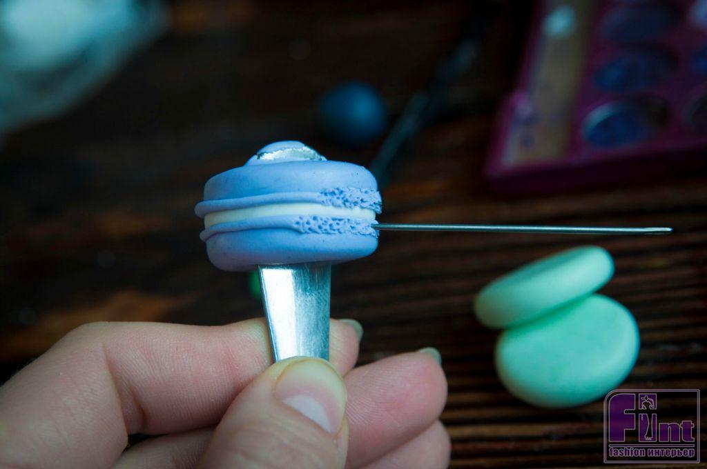 Насаживаем получившееся пирожное на ложку, предварительно прорезав отверстие в полимерной глине под черенок ложки канцелярским ножом, или иголкой. Затем продолжаем «ваять» и делать наше пирожное ещё более настоящим. Для этого накладываем в места примыкания наружных «лепёшек» к «крему» тонкий жгутик из полимерной глины того же цвета, что и само пирожное. В нашем случае – это нежно-голубой оттенок. Затем иголкой или зубочисткой наносим на жгутики пористую фактуру, в хаотичном порядке накалывая жгутики.