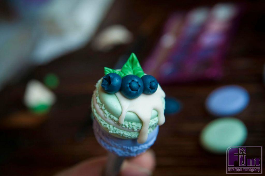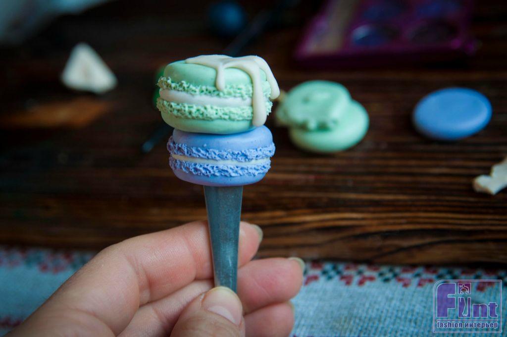 Второе пирожное делаем из нежно зелёной полимерной глины и также насаживаем его на черенок ложечки. Старайтесь насаживать аккуратно, но плотно, чтобы наши пирожные хорошо держались на черенке ложки.