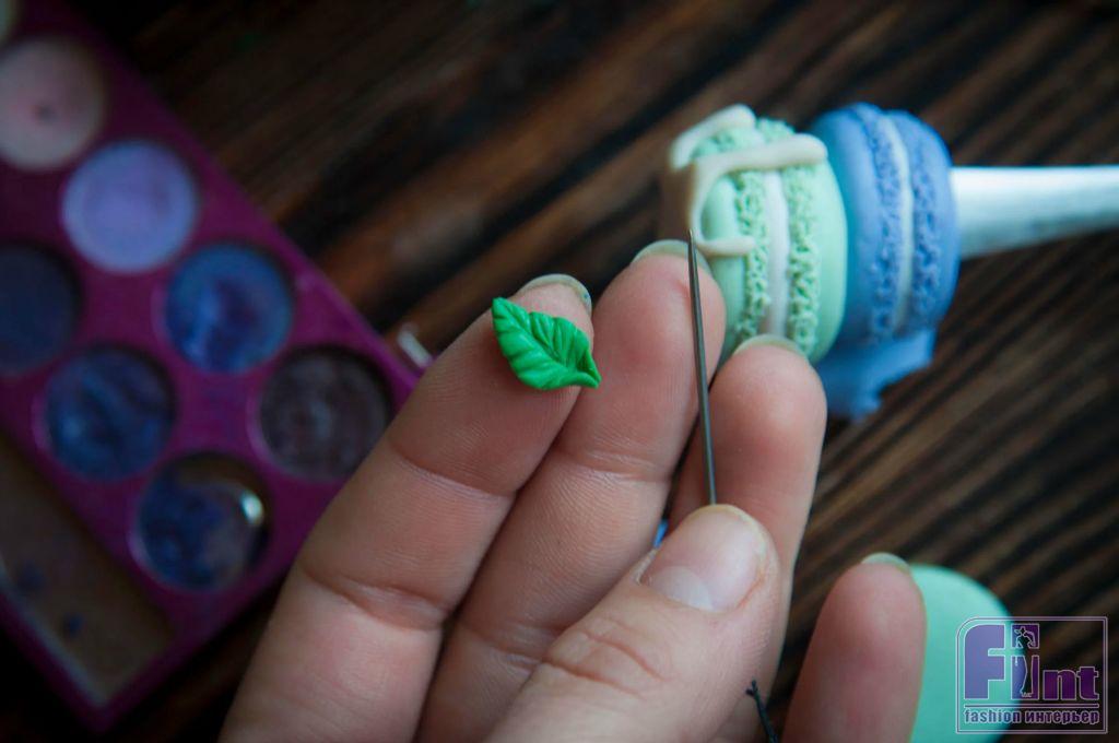 Из зеленой полимерной глины лепим листочки мяты, нанося узор на листьях кончиком иглы. Плотно закрепляем их на креме, предварительно сделав углубление в нем. Точно также закрепляем и заготовки под ягоды черники. Кстати, цвет настоящих ягод черники можно получить, смешав 4 горошины синего цвета с 1 горошиной чёрного.