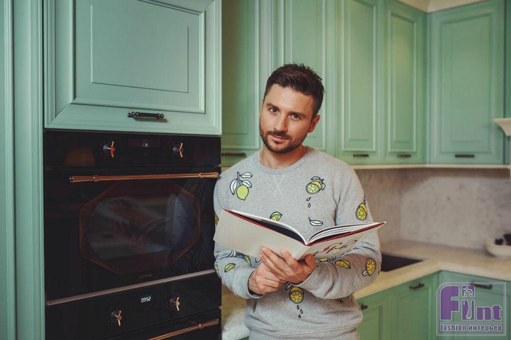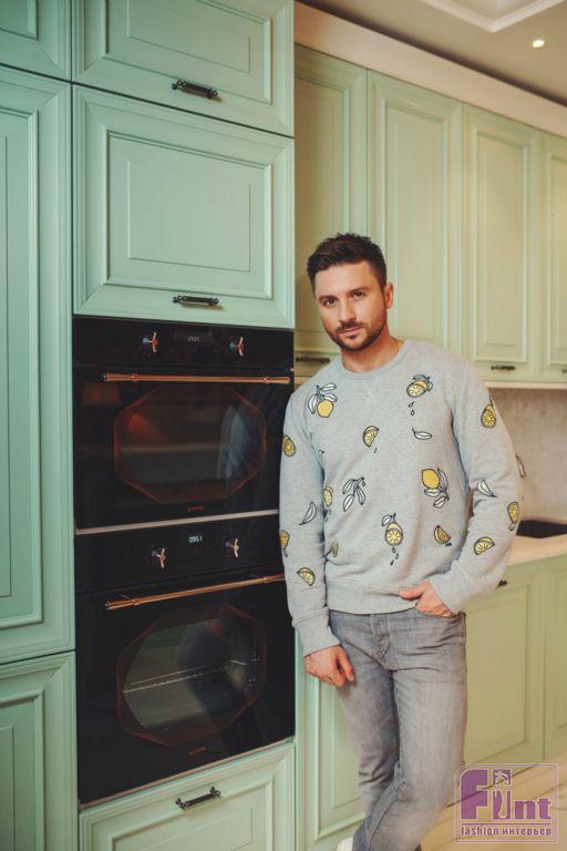 В качестве дополнительных отопительных приборов выступают современные тёплые плинтусы. Это «ноу-хау» на российском рынке, которое прогревает помещение не хуже привычных водяных радиаторов отопления. Кухонную мебель заказали на отечественном предприятии. Специалисты выбрали фасады с оттенком мяты и столешницу из испанского кварца. Стол в виде барной стойки держится на деревянных ножках и стеклянных витринах. Кухня певца оснащена ультрасовременным оборудованием: холодильником с умным управлением, индукционной плитой, трёхсекционной духовкой, посудомоечной машиной и стильной вытяжкой.
