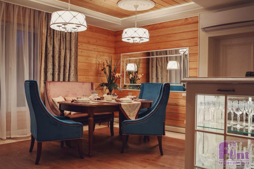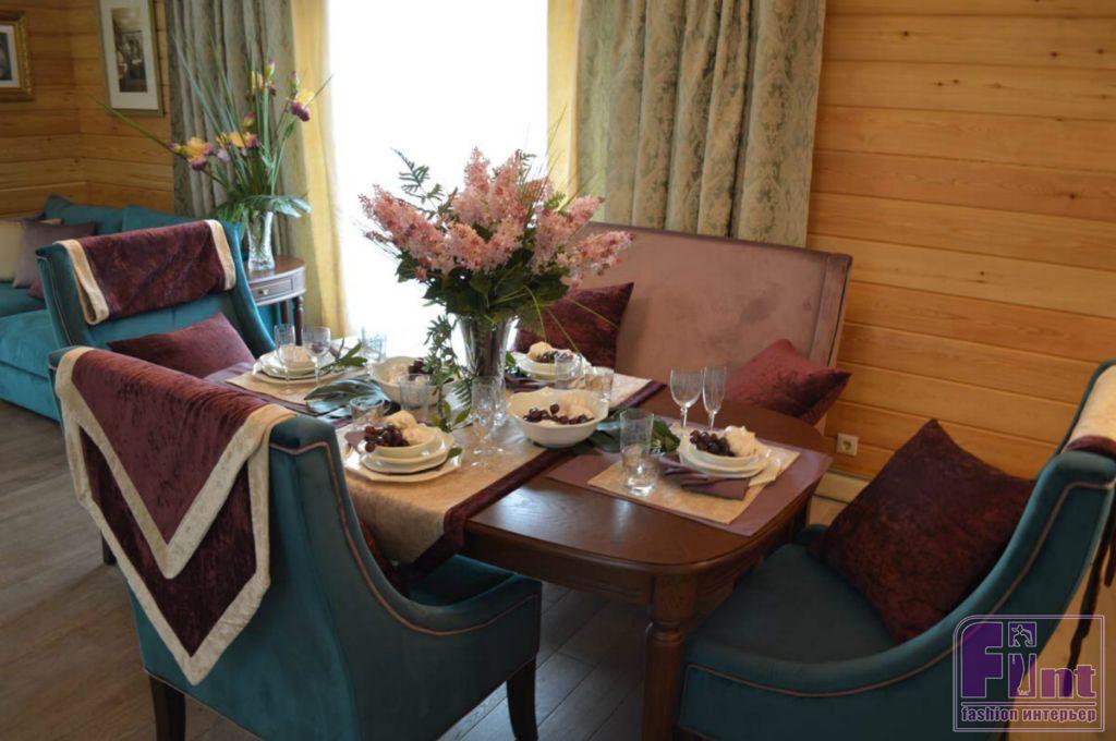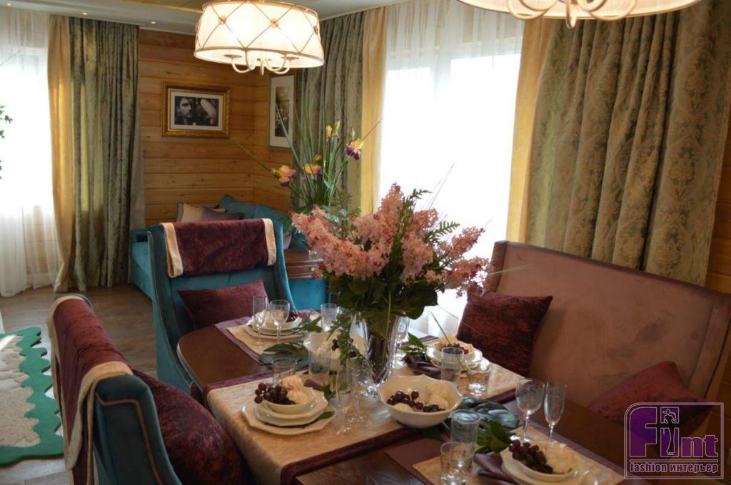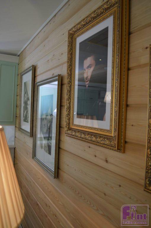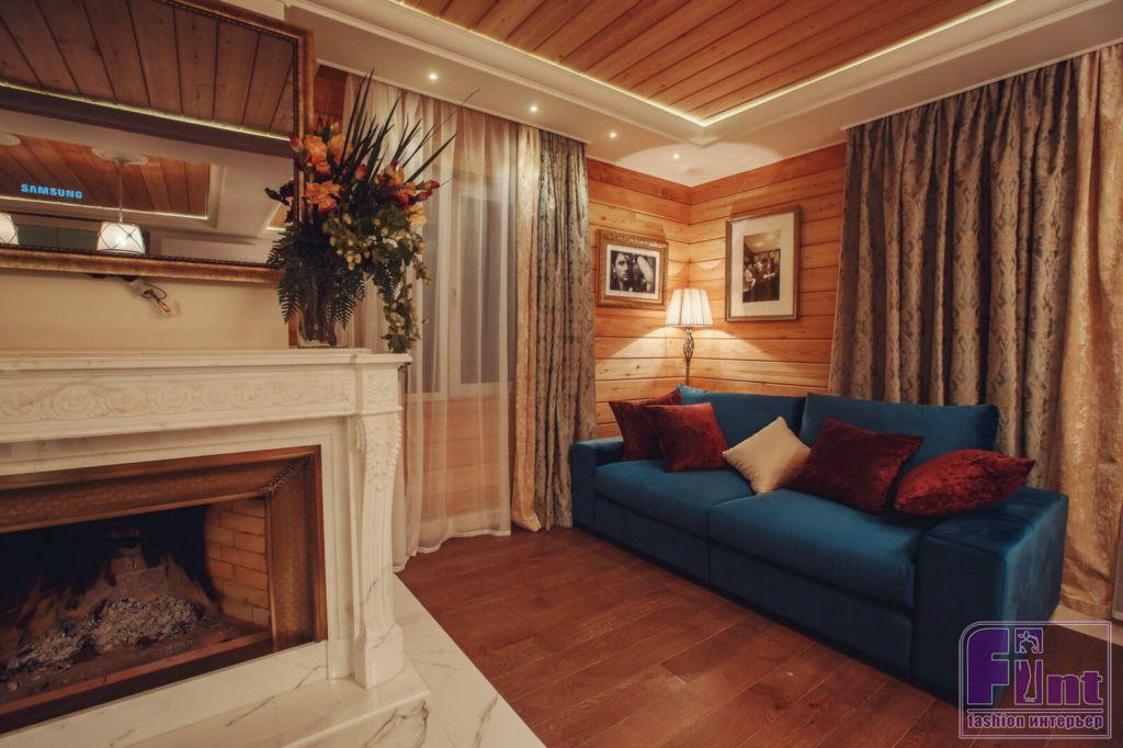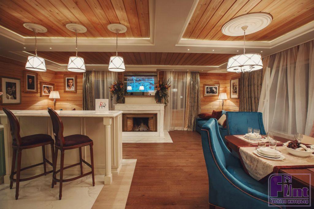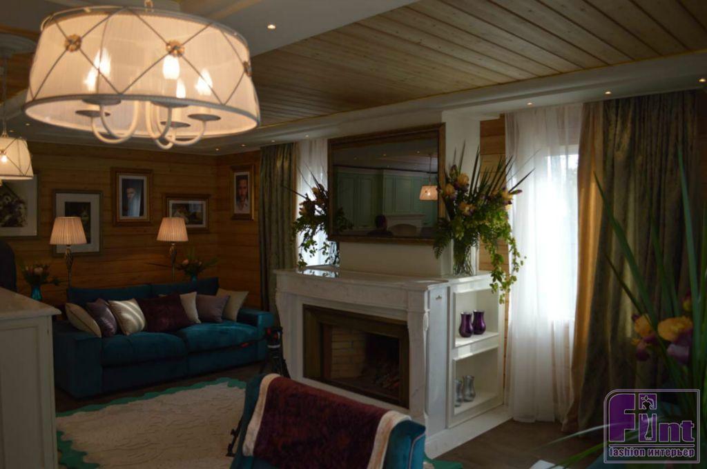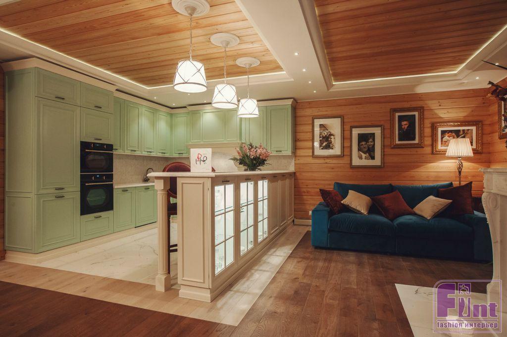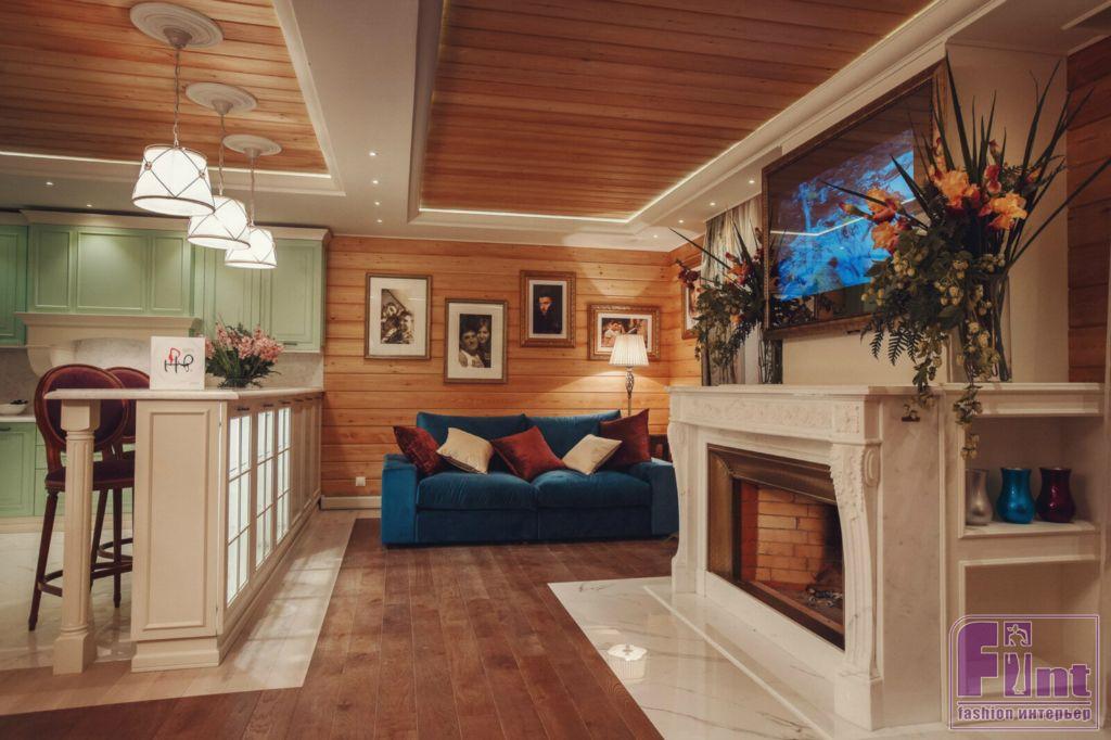 Просторную гостиную, совмещённую с кухней, решили сделать в стиле «Прованс», в привычных для этого стиля сливочно-мятных оттенках. Стены помещения оставили без отделки, сохранив прекрасный вид деревянного бруса. Покрыв поверхность бруса защитным составом, дизайнер добилась неповторимого уюта, который дарит настоящий бревенчатый деревенский дом. Камин сложили из огнеупорного материала, верхняя отделка — керамогранит и белый мрамор.