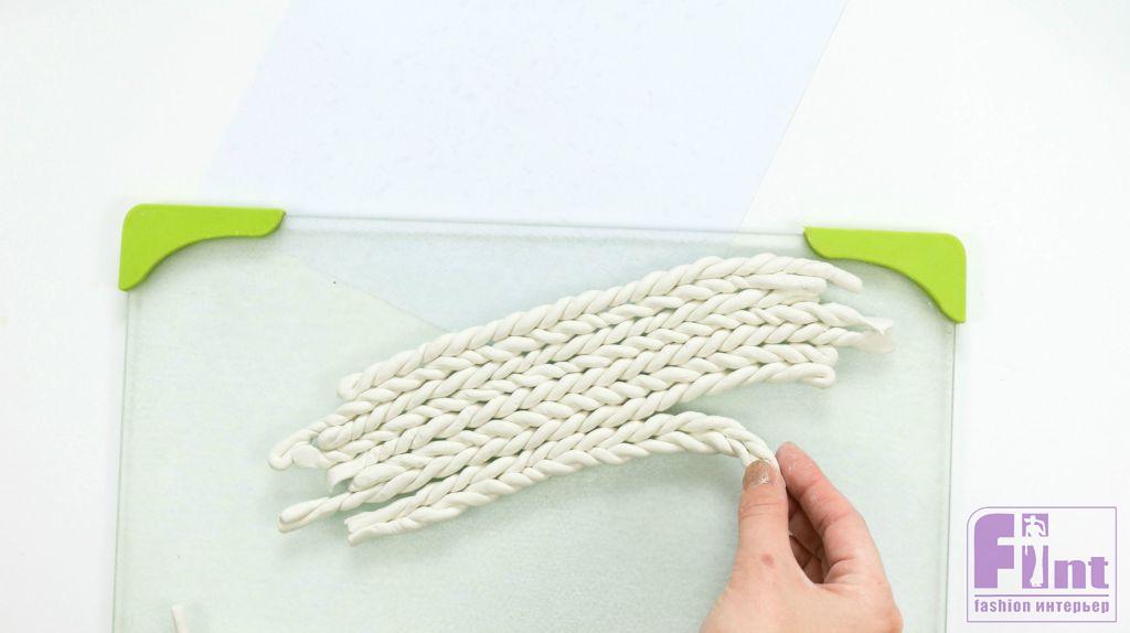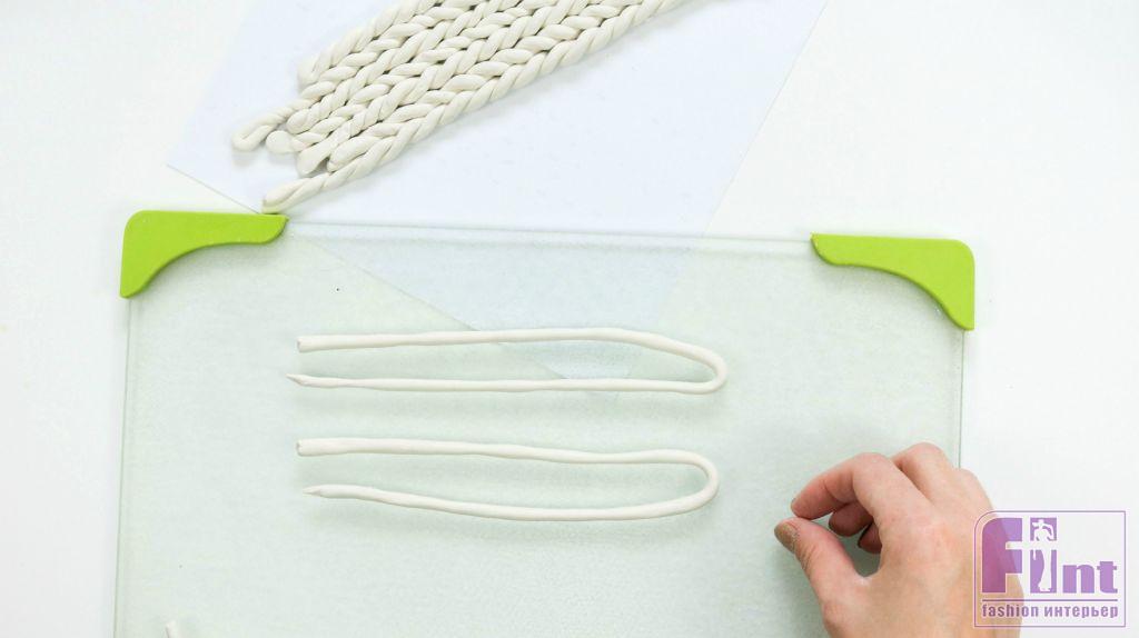 Возьмите одну часть от «колбаски» и аккуратно раскатайте её в более тонкую «нить» толщиной примерно 0,5 – 0,7 мм. Раскатывайте глину движениями вперёд-назад, не торопитесь и не прикладывайте к глине излишнего давления. Так у вас получится ровная длинная «нить». Сделайте такие заготовки, раскатав остальные части, нарезанные от «колбаски.