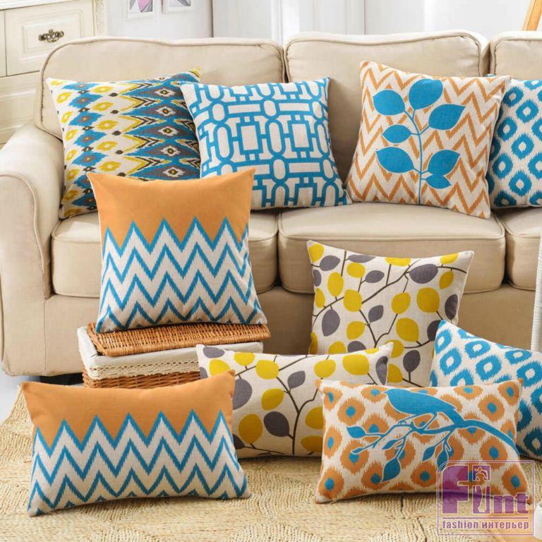 Главное, чтобы выглядело выразительно. Играйте на контрасте: если в целом интерьер у вас холодных оттенков, то подушки подбирайте в тёплой цветовой гамме. Или же наоборот.