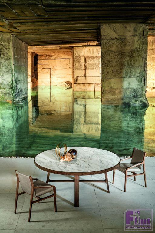 В основе дизайна круглого обеденного стола — контраст фактур. Тёплая древесина соседствует с прохладным мрамором, тёмный оттенок каркаса — со светлой поверхностью столешницы. Прочность модели придаёт крестовидная конструкция подстолья. На выбор каркас из окрашенного ясеня или итальянского ореха, топ из мрамора с прожилками или древесины. Столешница может быть дополнена вращающейся центральной подставкой.