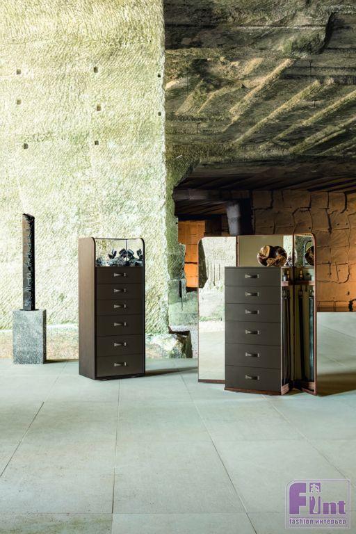 Практичный комод оснащён ящиками двух размеров для одежды и аксессуаров, а также дополнительными отделениями, где можно хранить ремни, галстуки и прочие аксессуары и мелочи. Дверцам для них служат два зеркальных «крыла», которые гармонично смотрятся и в закрытом, и в открытом виде. Модель может быть выполнена из термообработанного дуба, чёрного дуба или древесины итальянского ореха. Фасад облицован кожей, как и ручки выдвижных ящиков, украшенные видимой строчкой и элементами из сатинированного никеля. В противовес тёмной внешней отделке боковые отделения покрыты светлым матовым лаком.