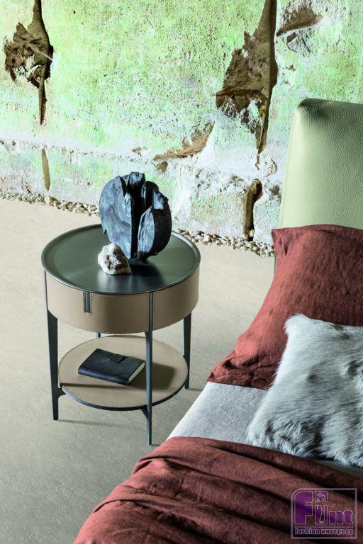 Одно название, две ипостаси. Модель предлагается как прикроватный столик с одним ящиком и открытой полкой, или как тумба с тремя выдвижными ящиками. Две версии роднит округлая форма и стальная столешница диаметром 43 см в отделке под титан. Обе доступны в термообработанном дубе, чёрном дубе, итальянском орехе или матовом лаке, а также в коже.