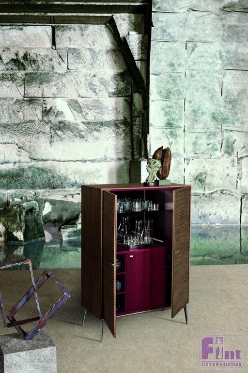 Барный шкаф скрывает несколько отделений для хранения бутылок, посуды и необходимых аксессуаров, позволяя с комфортом сервировать напитки или смешивать коктейли. Створки в итальянском орехе или матовом лаке украшают декоративные вставки с горизонтальным рельефом, придающим образу динамику. Тонкие линии литых алюминиевых ножек перекликаются с формой металлической ручки на фасаде. Доступна версия модели, дополненная ящиками и встроенным мини-баром.