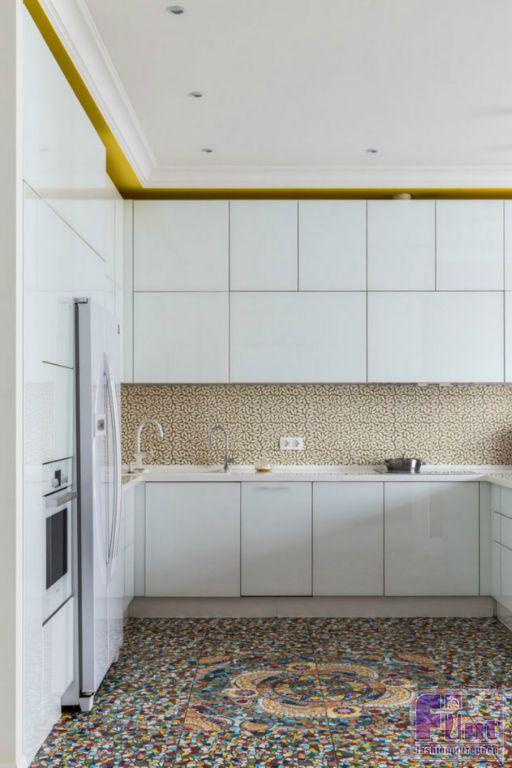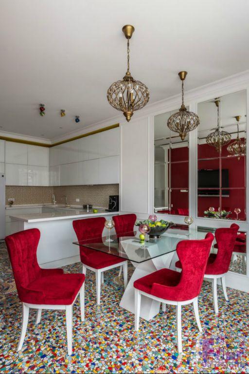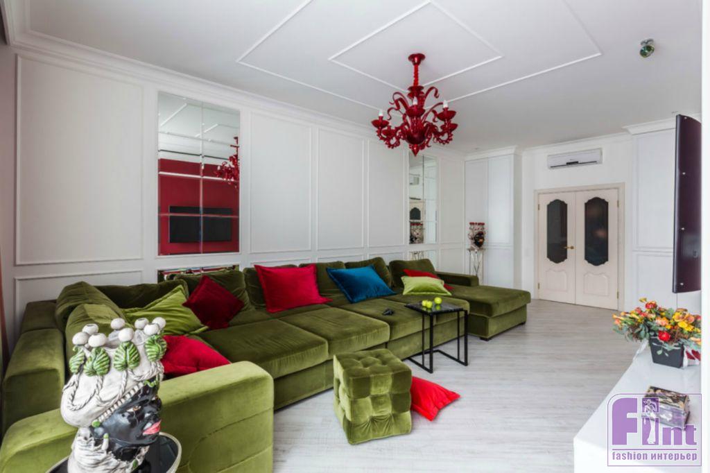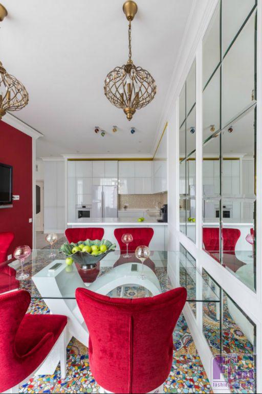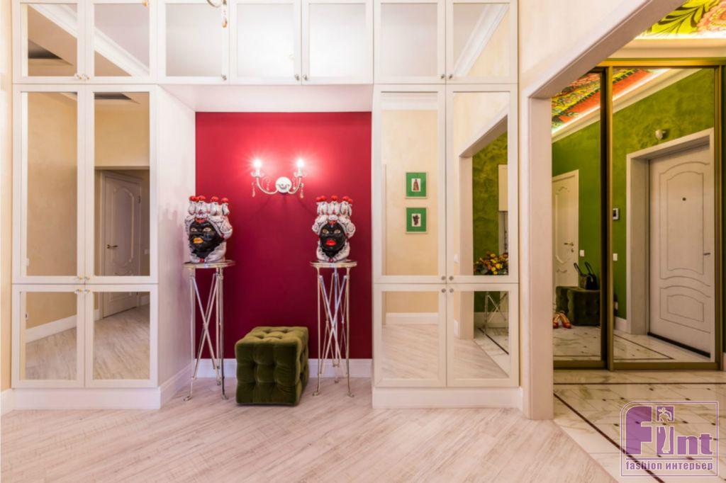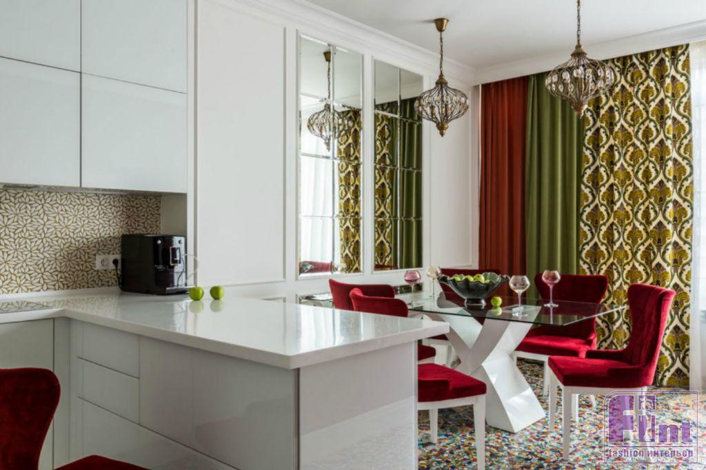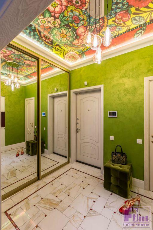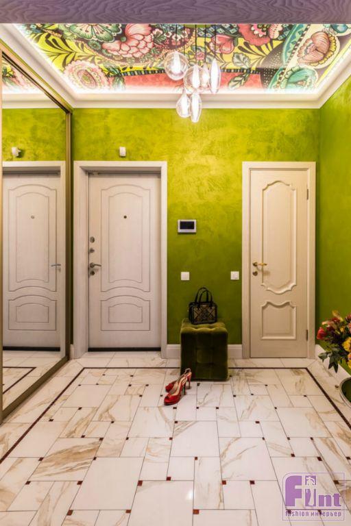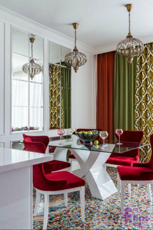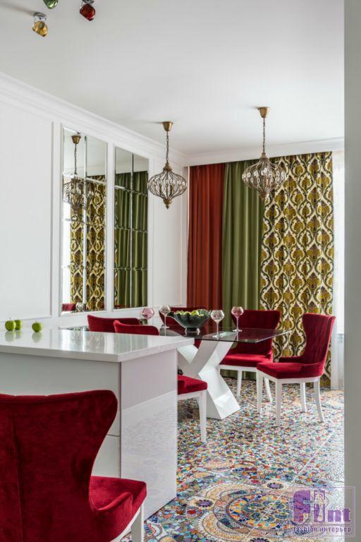 В результате полного карт-бланша, полученного автором от хозяев жилья, получилась задорная по настроению эклектика. В интерьере развернулась целая фантасмагория оттенков и декора, которая начинается цветочным потолком в прихожей и не заканчивается даже в спальнях. Самый «буйный» из всех — пол в кухне, который пикселизуется бесконечными цветными осколками средиземноморской мозаики. И он не выглядит китчем, потому что работает единственным в столовой зоне ярким пятном на контрасте с минималистичной кухней. Так же эффектно на фоне белых стен смотрится диванный остров: его «зелень» тиражируется в отражениях зеркальных панно, за которыми по обе стороны от двери спрятаны шкафы.