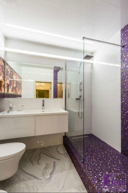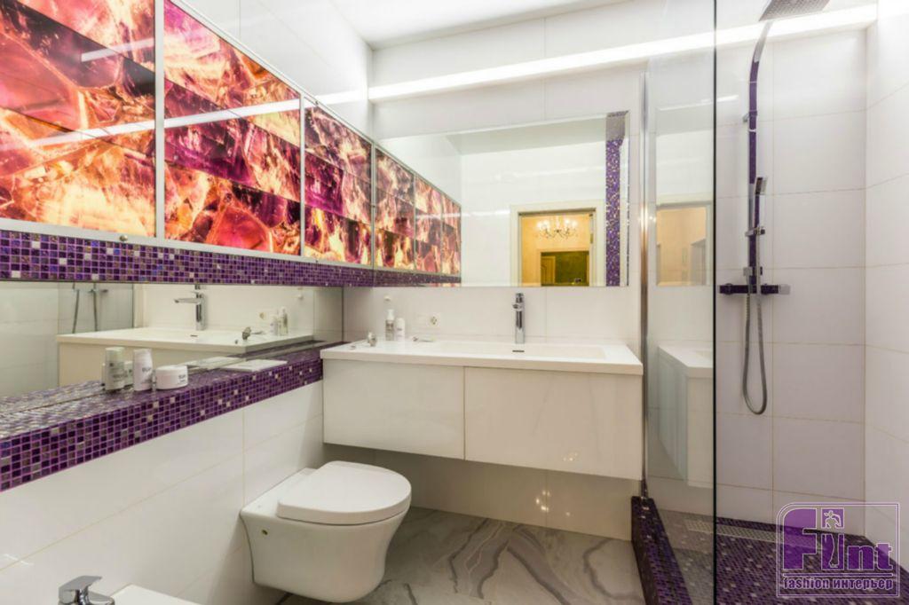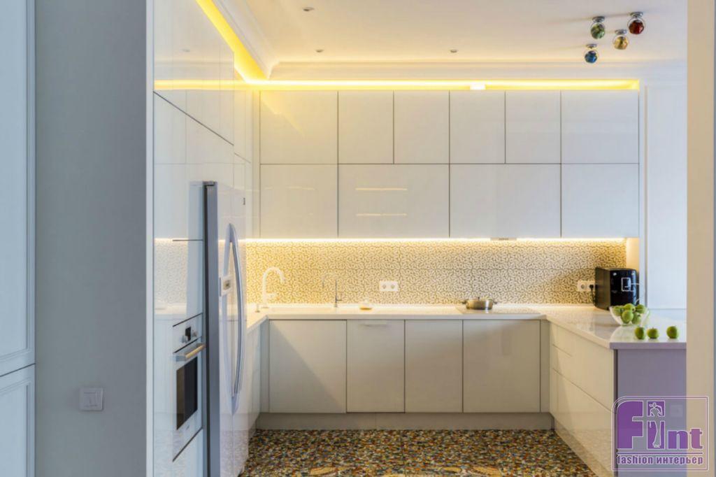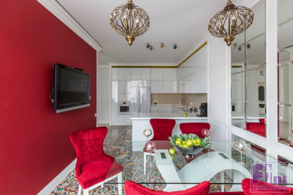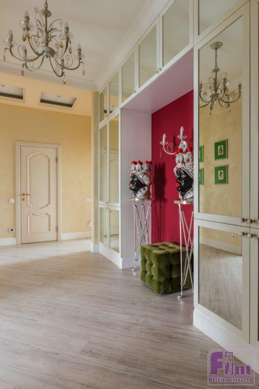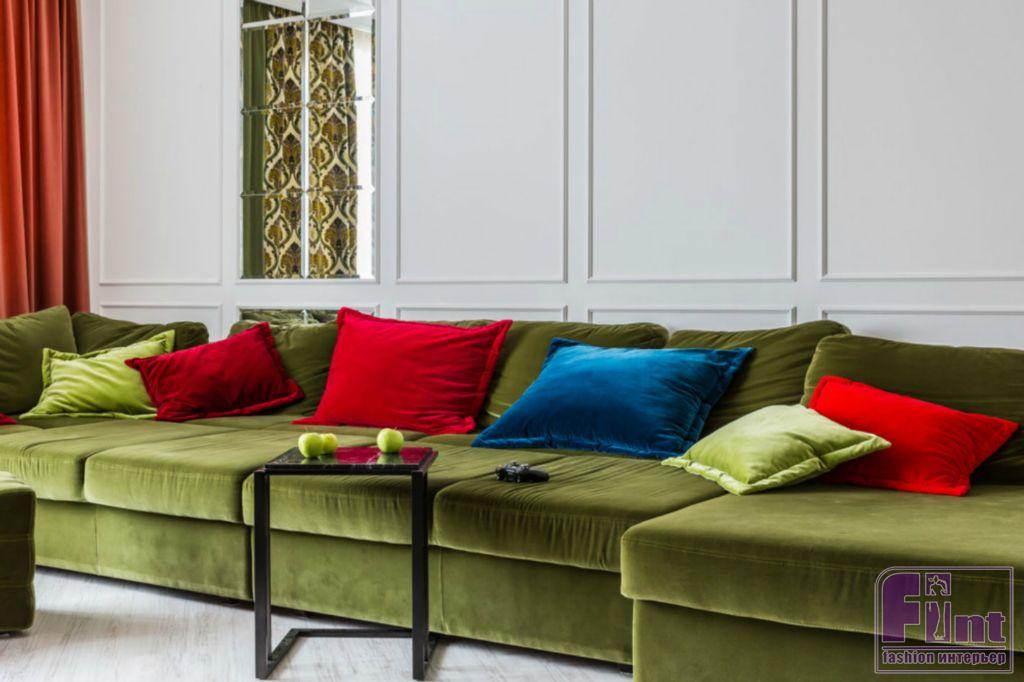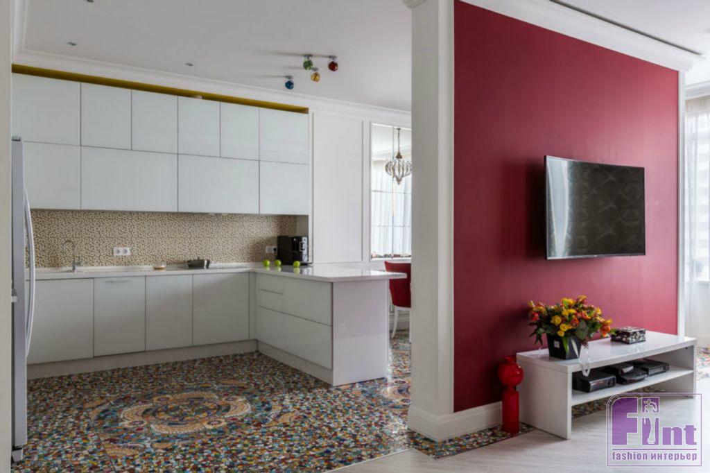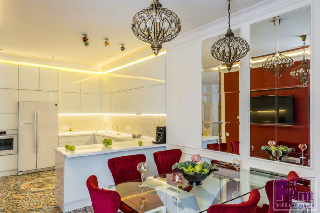 В результате полного карт-бланша, полученного автором от хозяев жилья, получилась задорная по настроению эклектика. В интерьере развернулась целая фантасмагория оттенков и декора, которая начинается цветочным потолком в прихожей и не заканчивается даже в спальнях. Самый «буйный» из всех — пол в кухне, который пикселизуется бесконечными цветными осколками средиземноморской мозаики. И он не выглядит китчем, потому что работает единственным в столовой зоне ярким пятном на контрасте с минималистичной кухней. Так же эффектно на фоне белых стен смотрится диванный остров: его «зелень» тиражируется в отражениях зеркальных панно, за которыми по обе стороны от двери спрятаны шкафы.