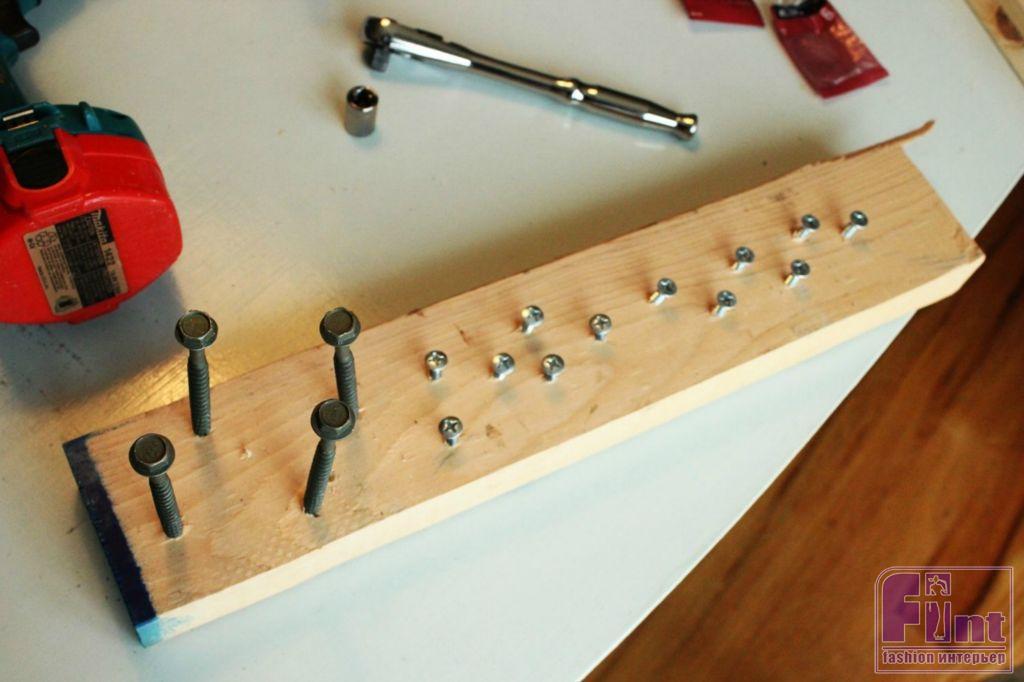 Вкрутите на пару оборотом все наши шурупы в ненужный кусок древесины и окрасьте их в тёмно-серый цвет при помощи аэрозольного баллончика. Нам важно, чтобы краска хорошо легла только на «шляпки» шурупов, которые будут видны в готовом изделии. Цвет должен примерно соответствовать цвету фитингов труб. Оставьте шурупы сохнуть и займитесь электрической разводкой.