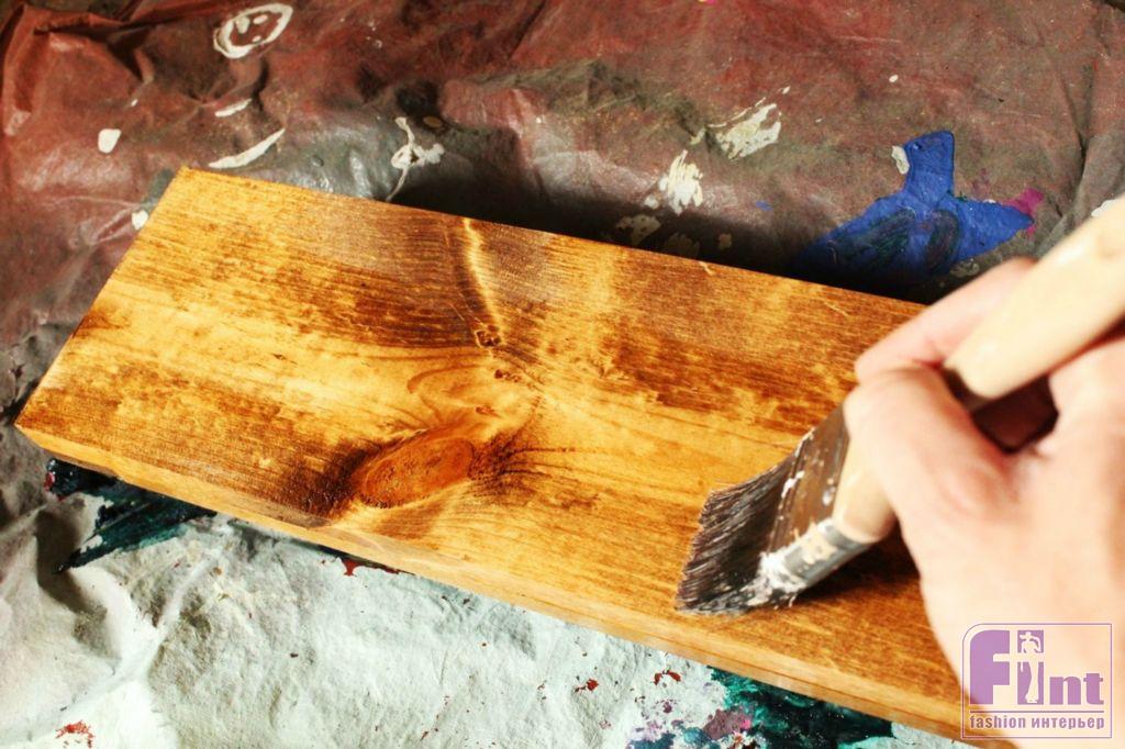 Пока сохнут наши шурупы и приклеенный к «уголку» «патрон», покройте деревянную основу светильника морилкой. Используйте мягкую широкую кисть и нанесите морилку на все поверхности деревянной основы, включая боковые поверхности. При помощи повторных нанесений морилки контролируйте интенсивность цвета, пока не получите глубокий, насыщенный оттенок медового тона. Подождите, пока морилка полностью высохнет.