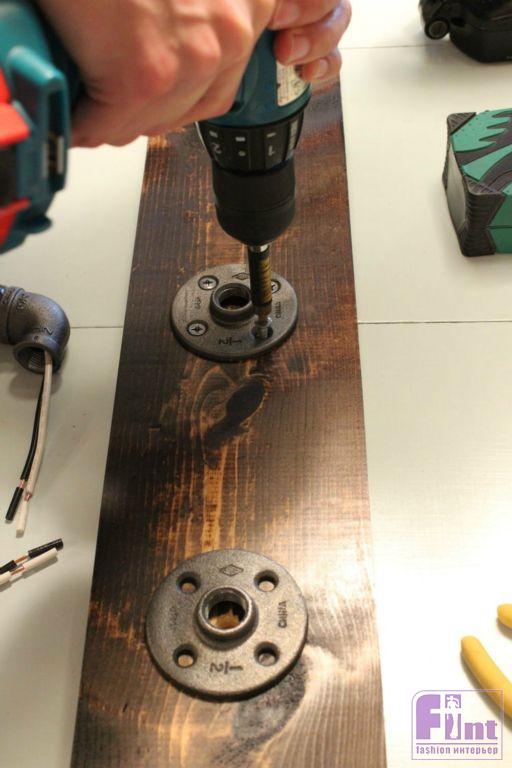 Просверлите отверстия в доске и стене, установите в стену дюбели и, аккуратно уложив провода с обратной стороны доски, прикрутите её на 4 шурупа. Обязательно проверяйте правильность установки при помощи строительного уровня! Осталось только вкрутить подходящие лампочки в наш светильник и потрясающий светильник в индустриальном стиле готов!
