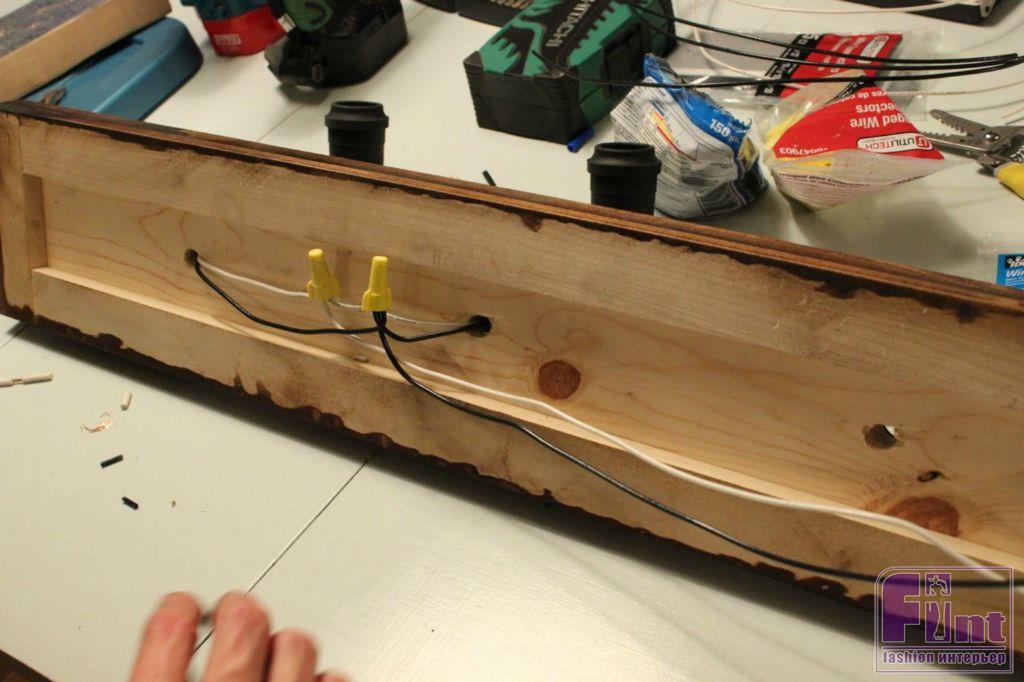Для дополнительной защиты от влажной среды ванной комнаты, замотайте места крепления проводов изолентой. Соберите держатели для ламп, вкрутив «уголки» в бочонки, а затем вкрутив их во фланцы, закреплённые на доске. Выполните разводку с обратной стороны светильника, укладывая провода в углубление, образованное рейками.