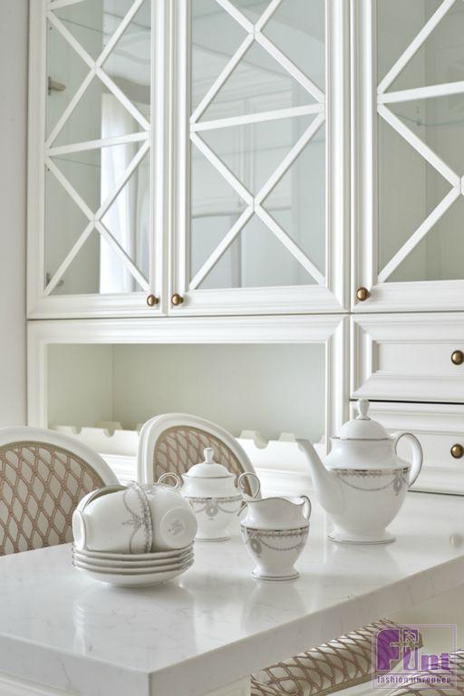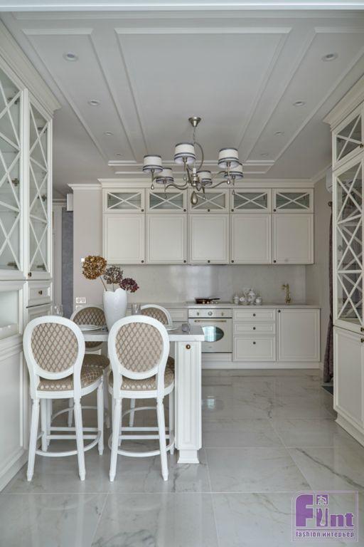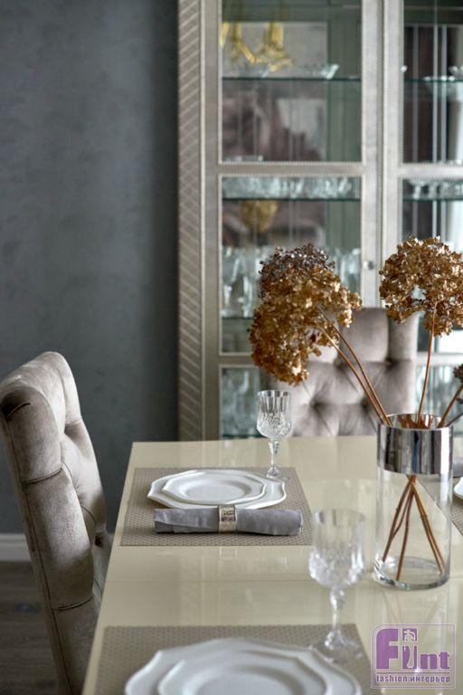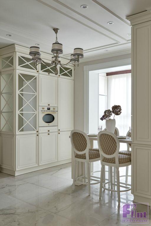 В кухне были созданы весьма практичные и эргономичные условия для приготовления повседневной пищи и настоящих кулинарных шедевров. По проекту в кухонной зоне была установлена современная бытовая техника и кухонная мебель, в соответствии с общей концепцией квартиры. Автор решила реализовать мечту супругов и органично вписать, выбранную ими фреску с пионами в обновленный интерьер кухни-гостиной.