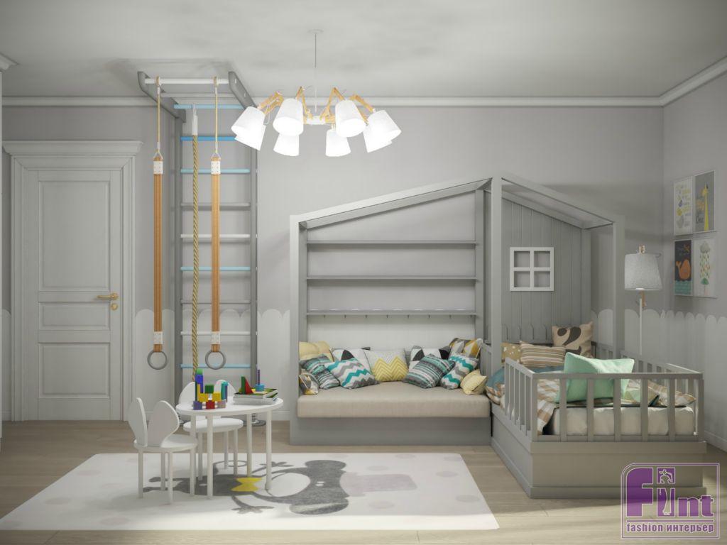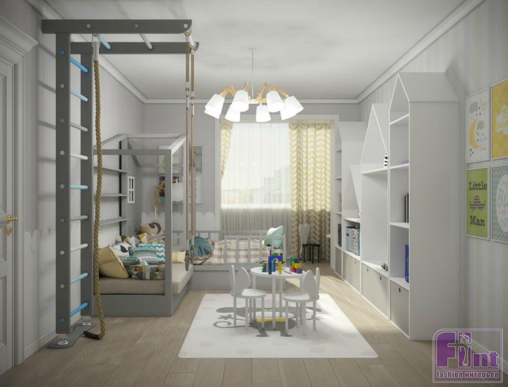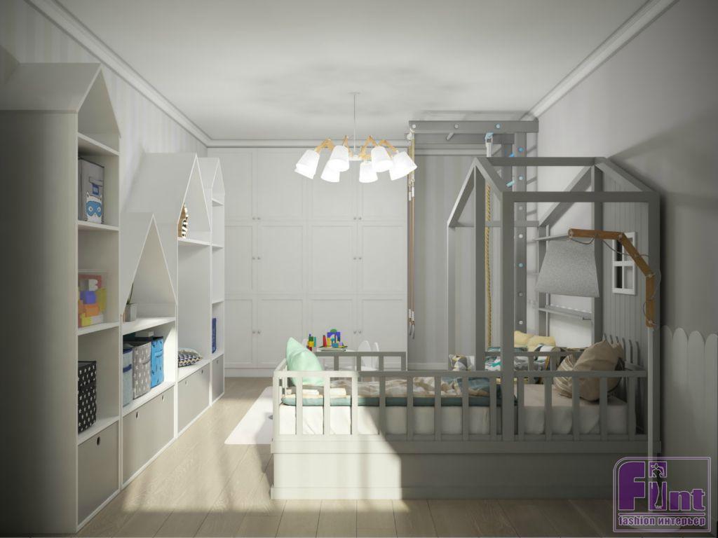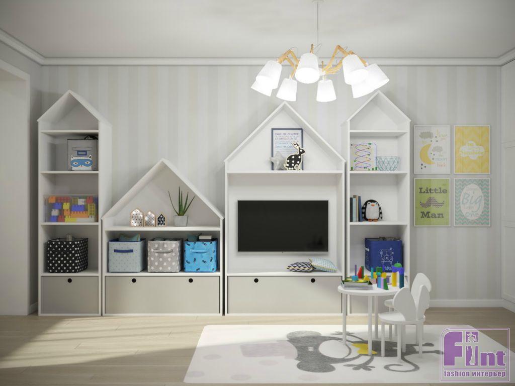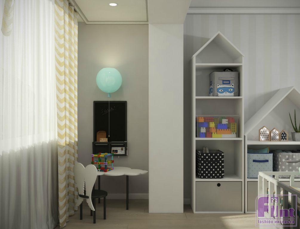 Помещения квартиры были полностью подготовлены к оформлению и оснащению. Отсутствие муниципального ремонта облегчило задачу для мастеров и дизайнеров проекта. Сами супруги хотели создать в пустующем пространстве настоящее семейное гнёздышко для себя и ребёнка. Главная комната – гостиная. Она получилась многофункциональной, практичной и, конечно, уютной. В одном пространстве дизайнеру удалось совместить функционал гостиной, столовой и игровой, не забыв про вместительные системы хранения и гардероб.