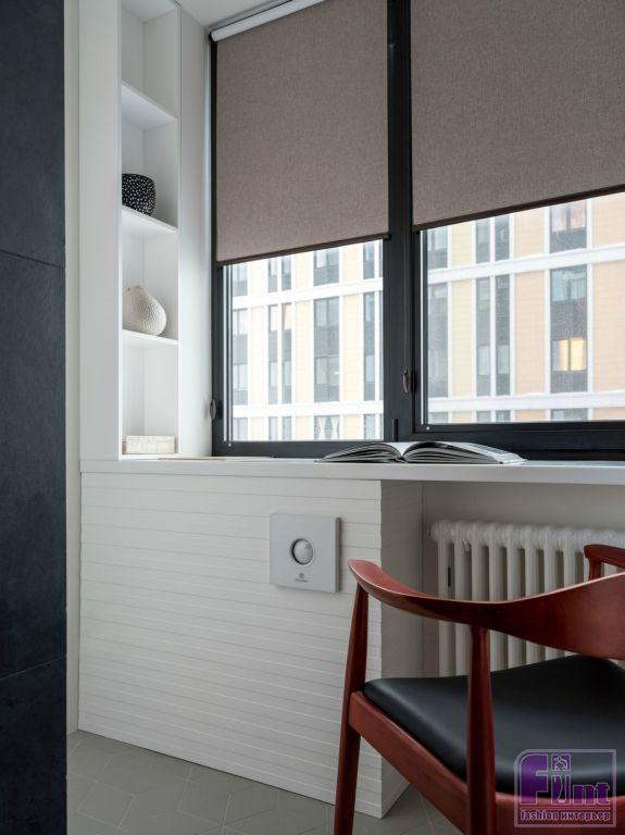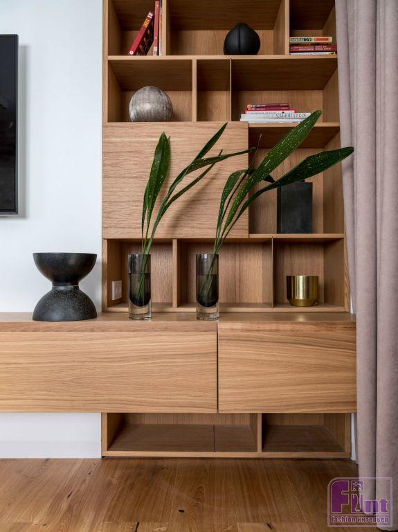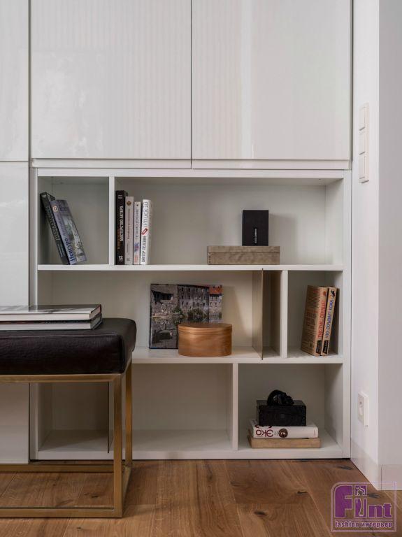 Для этой квартиры дизайнеры разработали специальные встроенные шкафы в гардеробной и прихожей, которые были изготовлены на заказ. Шкафы в интерьере выражены стеллажами — эти системы хранения есть в спальной комнате и гостиной. Для того чтобы помещение визуально выглядело просторнее, отдельностоящих предметов в этом дизайн-проекте Павел и Алексей не использовали.