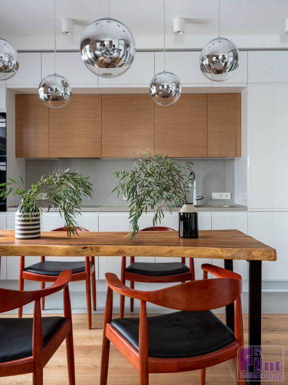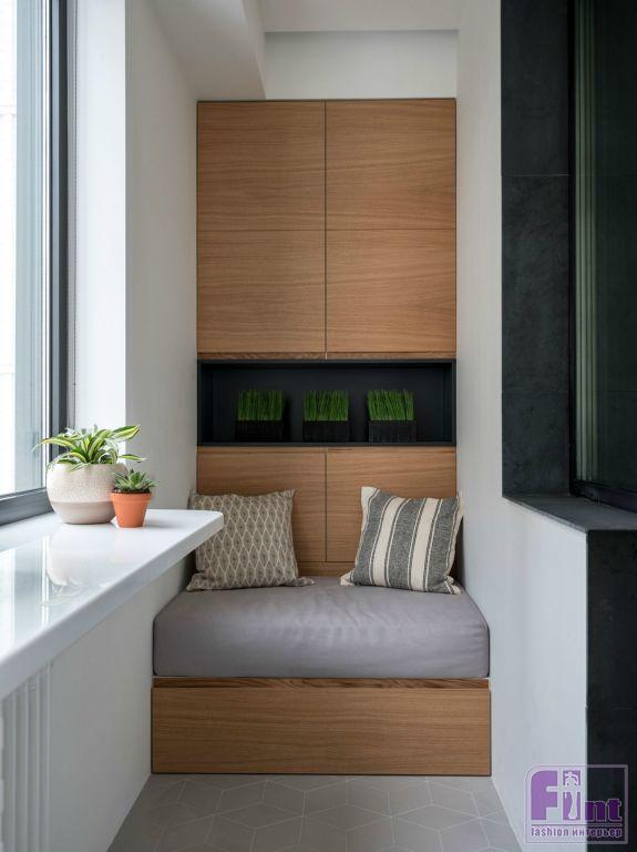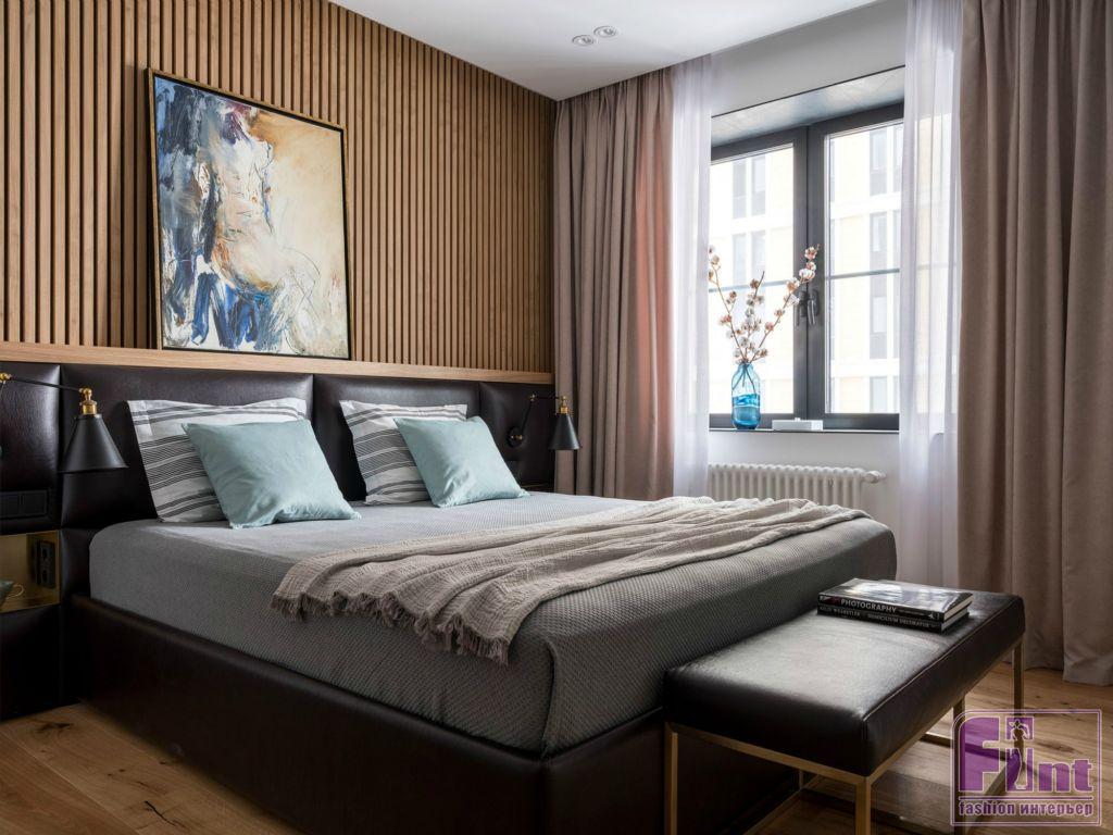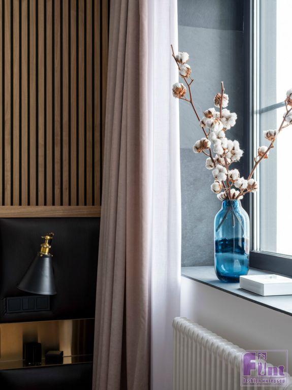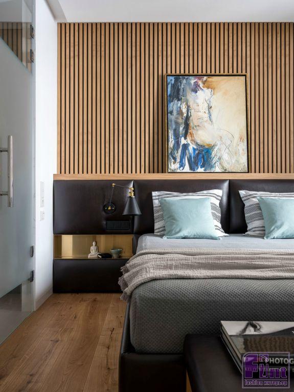 Для того чтобы визуально увеличить пространство квартиры, по всем помещениям повторяются одни и те же отделочные материалы, стилистически объединяющие квартиру в единый «организм» — покраска, дерево, керамогранит. В качестве напольного покрытия используется паркетная доска. Этот цвет натурального дерева повторяется в отделочных материалах мебели — деревянные изделия, шпонированные шкафы, деревянные рейки на стене в спальне. Все деревянные элементы в квартире решены в одном цвете. Единственное исключение — стол из суара в гостиной зоне: он немного темнее.