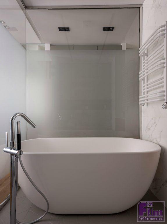 Ванную комнату руководители студии Geometrium сделали открытой, отделив её от спальни только с помощью стеклянной прозрачной перегородки. Это решение было сделано для того, чтобы визуально увеличить размер помещения. Также в квартире по пожеланию заказчика предусмотрели отдельный гостевой санузел с душевой кабиной. Балкон в квартире, по замыслу дизайнеров, превращён в комфортную лаундж-зону. Поскольку заказчик является поклонником кальяна, дизайнеры предусмотрели на балконе довольно мощную вытяжную вентиляцию.
