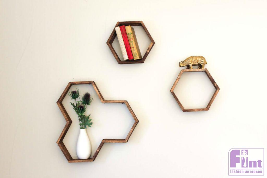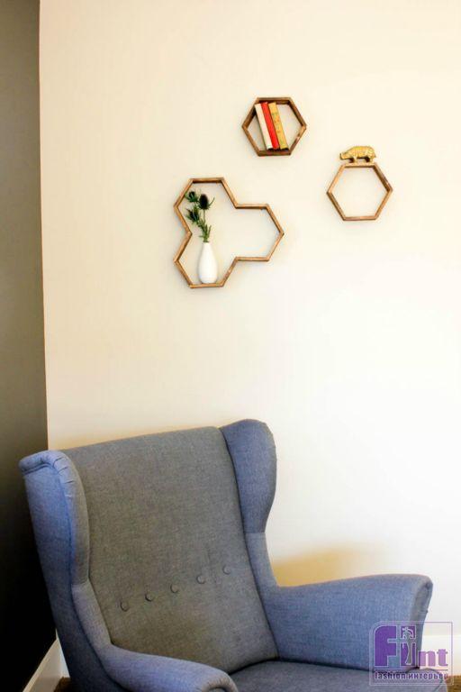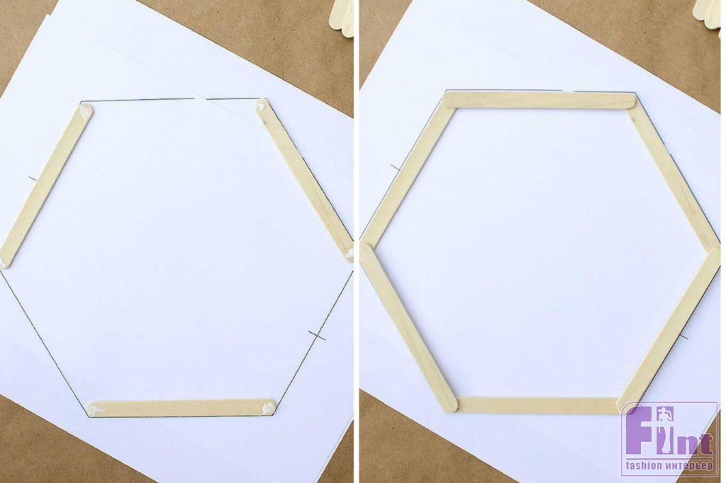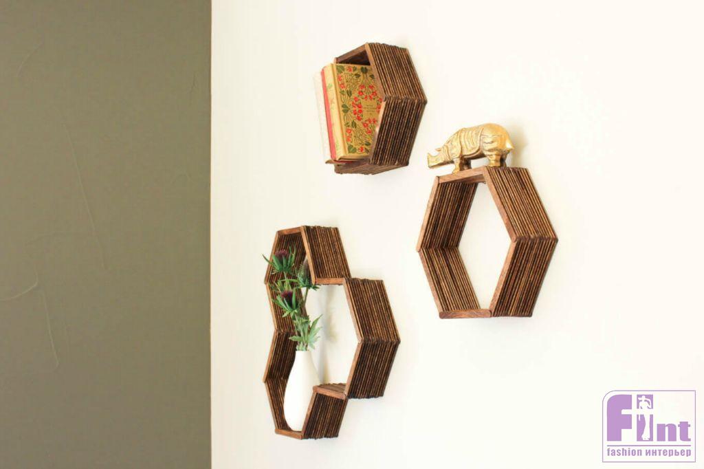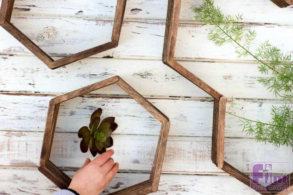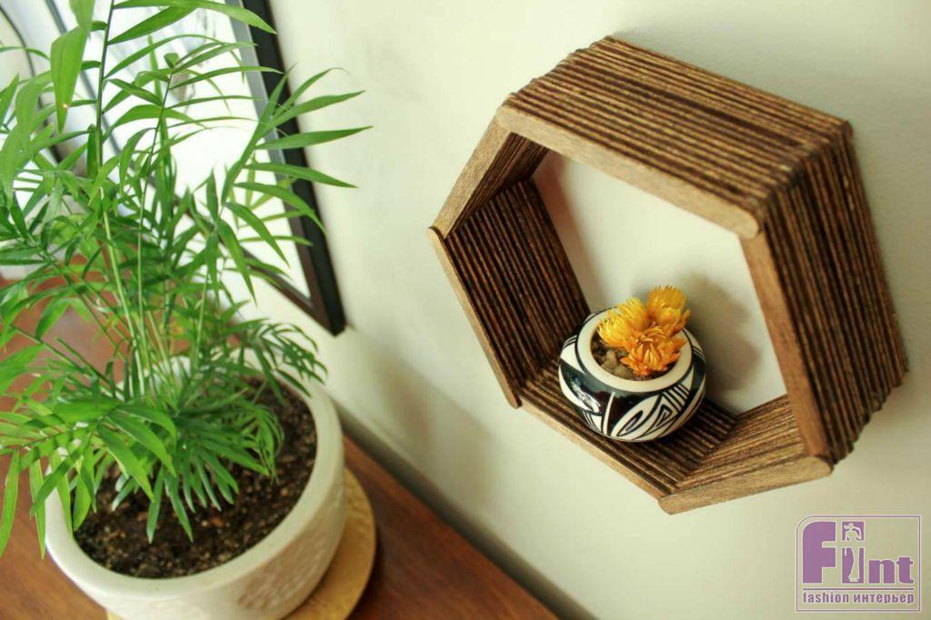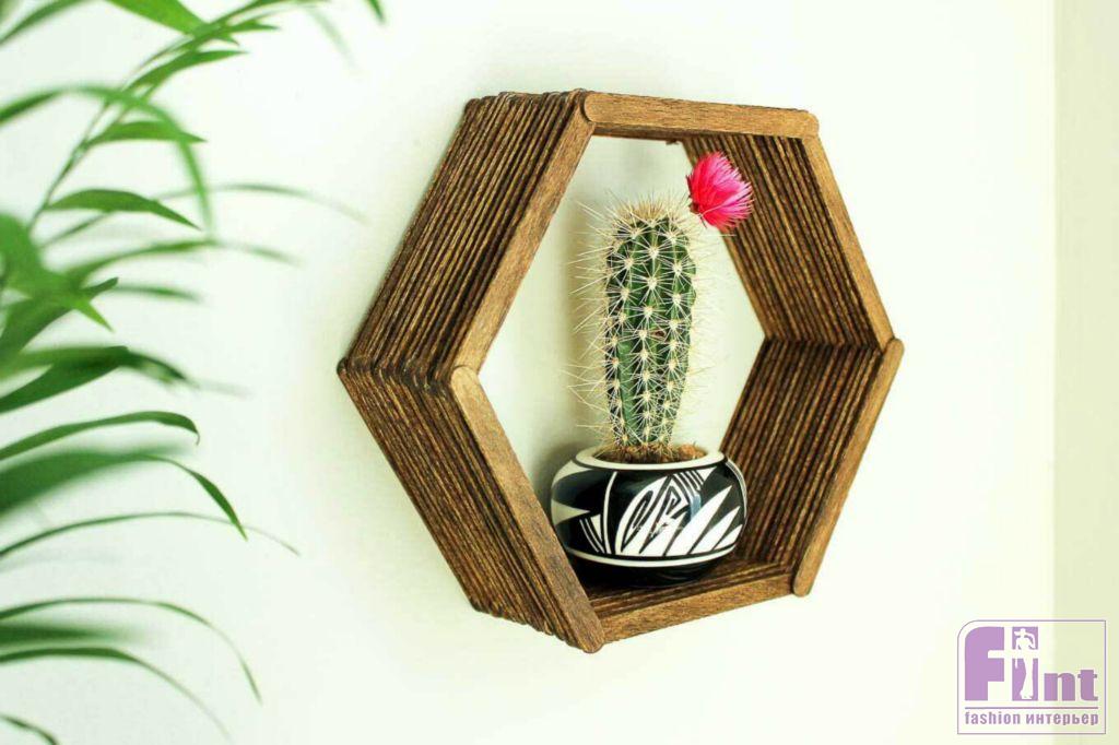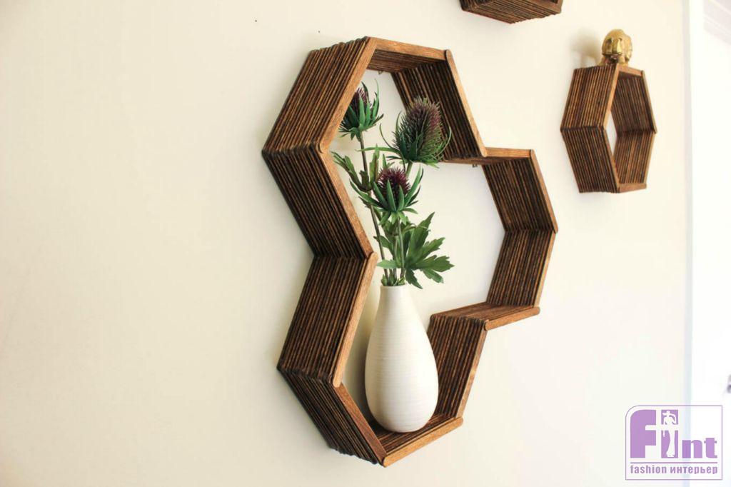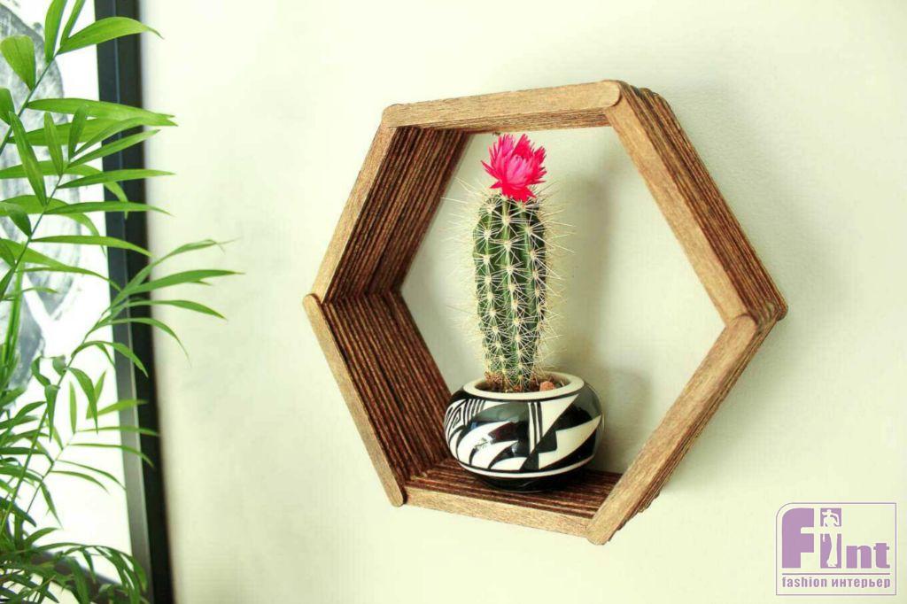 Осталось подвесить готовую полочку на пару небольших гвоздиков и прекрасное украшение и полезный аксессуар для вашего интерьера готов! Полка, несмотря на свой ажурный вид, довольно прочная и может выдержать небольшое кашпо с цветами, несколько книг или красивую статуэтку. Кстати, используя шаблоны другой формы и немного больше палочек от мороженого, вы можете соорудить своими руками не только небольшую шестиугольную полочку, но и довольно крупные настенные полки в виде пчелиных сот с шестиугольными базовыми элементами.