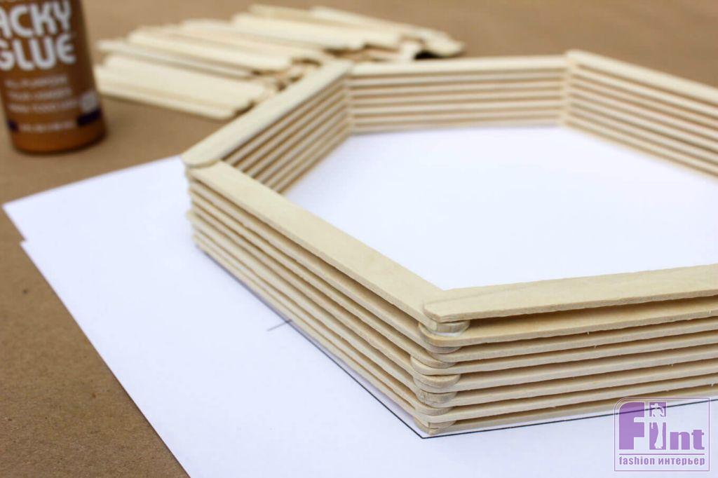 Изготовление полочки начнём с трёх палочек, которые нужно уложить на шаблон, пропуская одну грань. Добавьте немного клея на самые кончики этих трёх палочек и положите сверху следующие три палочки, плотно придавив их в месте контакта. Затем продолжайте, выполняя аналогичные действия, укладывая по три палочки на слой, пропуская одну грань. Старайтесь, чтобы палочки ложились ровно, без сдвигов. Только так у нас получится красивая полочка с правильными и ровными гранями. Доведите количество слоёв до нужной глубины полочки. Мы сделали 17 слоёв на первых трёх гранях и 16 слоёв из палочек на гранях, расположенных между первыми гранями. Оставьте заготовку сохнуть на ночь.
