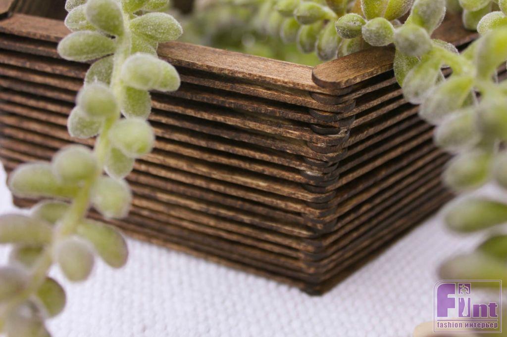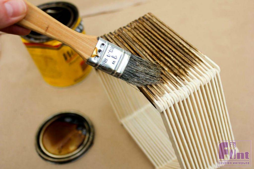 Высохшую шестиугольную конструкцию из палочек от мороженого мы решили задекорировать, покрыв её морилкой по дереву тёмного оттенка. Чтобы убедиться, что итоговый цвет вас устроит, попробуйте нанести морилку на запасную палочку, не использованную при склеивании полочки. Если цвет вас устраивает, начинайте окрашивать полочку, используя мягкую кисточку. Мы рекомендуем сначала окрасить внутренние грани полочки, затем внешние и после этого лицевую поверхность. Окрашивать заднюю часть полки не обязательно, поскольку она будет обращена к стене.