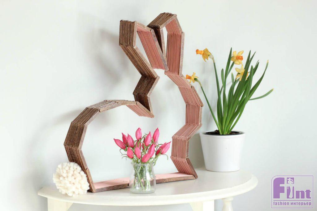 А если эти строгие геометрические формы вам не нравятся, из палочек от мороженого можно сделать даже очень необычную полку в виде зайчика! Но для этого вам потребуется найти или нарисовать самому шаблон фигуры забавного ушастого зверька, или другого представителя фауны.