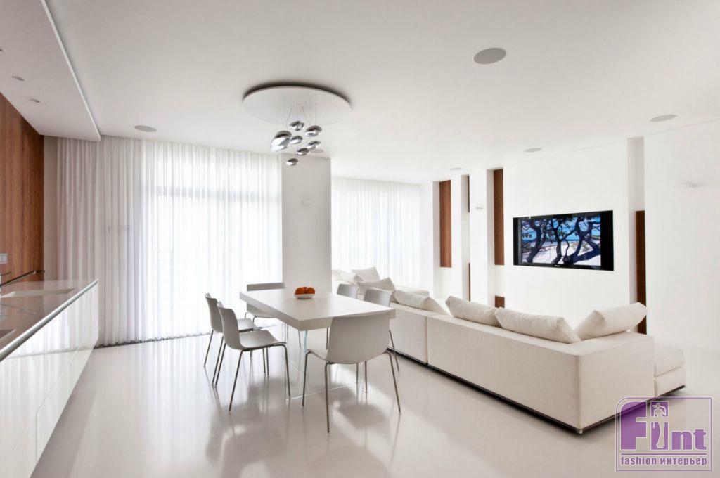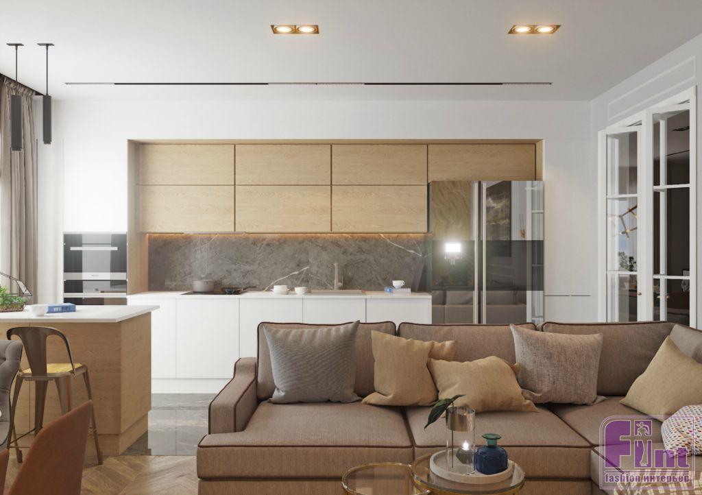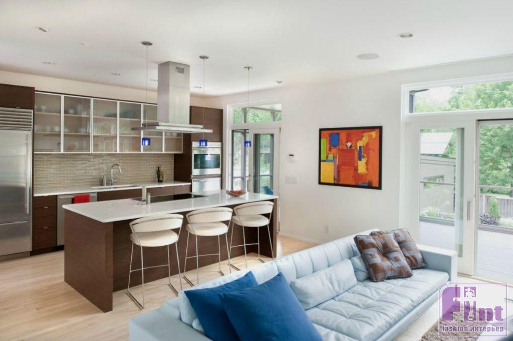 Поскольку кухня и гостиная расположены в одной комнате, на них действует золотое правило «3+3». Три основных и три дополнительных акцентных цвета должны повторяться в обеих зонах. Но можно, например, выбрать цветной кухонный гарнитур, а в гостиной использовать этот же оттенок только в декоре. То есть в одной зоне цвет будет основным, а в другой – дополнительным. Более гармоничной интеграции кухни в гостиную будет способствовать и единая цветовая гамма и фактура стен. В этом случае при правильной планировке переход от гостиной к кухне будет почти незаметным.