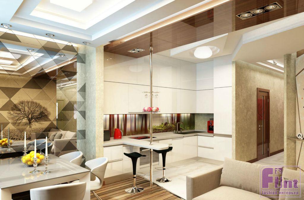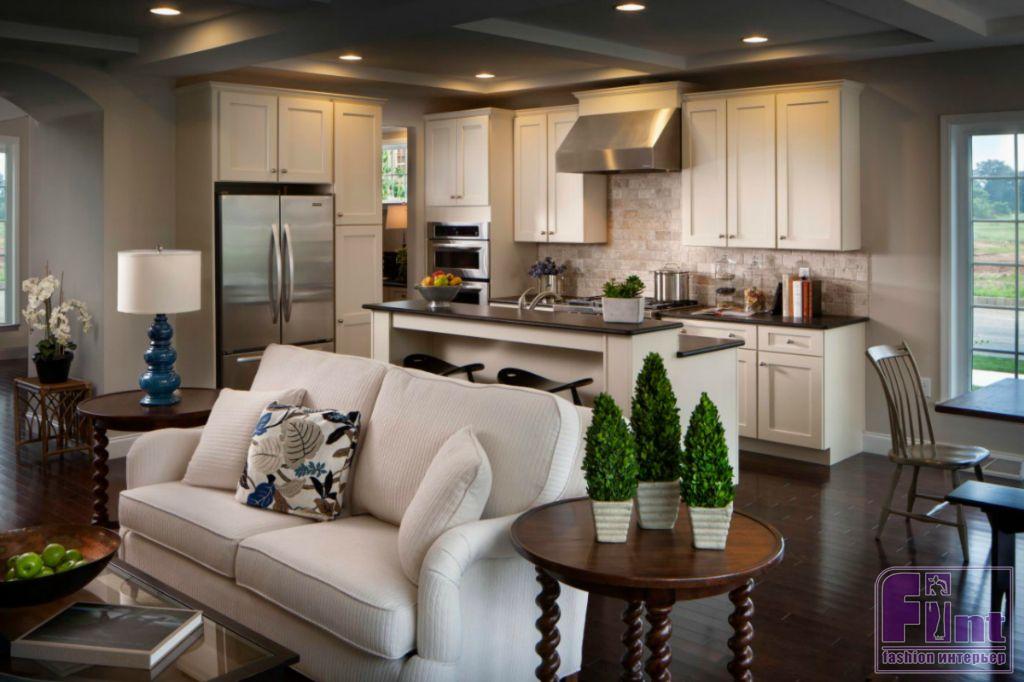 Если гостиная современная, то и кухня должна быть такой же, если классическая – тоже. Смешивать стили и получать эклектику можно, но нужно понимать, что эклектика создаётся внутри одного помещения, а не путём совмещения в квартире комнат с абсолютно разными стилями. Так, например, весьма странно будет выглядеть совмещение современного хай-тека на кухне, с его прямыми и чёткими линиями, стеклом и хромом, с гостиной, оформленной в стиле ар-деко. Если вы всё-таки хотите сделать кухню и гостиную в разных стилях, лучше всего совмещать родственные интерьерные форматы, например, шебби-шик и прованс, или марокканский и средиземноморский стили.