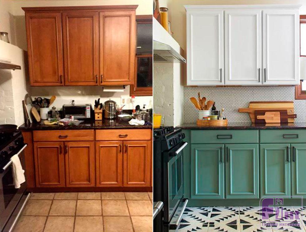 Интерьер изменится до неузнаваемости, и вам не придётся тратить для этого много денег. Выбирайте лаконичный белый, солнечный жёлтый, глубокий синий или любой другой цвет для старой новой кухни. Причём окрашивание кухни не займёт у вас много времени, ведь для такого декорирования нужно лишь снять с петель дверцы шкафов и покрасить их с лицевой стороны. Окрашивание можно выполнять нарочито грубо, мазками, с использованием кисточек, или же красить очень аккуратно, применяя аэрозольные баллончики с краской.