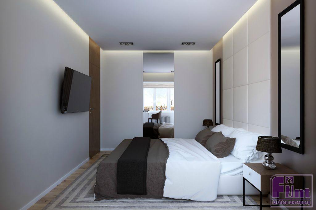 Вертикальные элементы в спальне — двери, шторы, изголовье, зеркала на стенах — визуально увеличивают высоту потолка. За зеркальной дверью располагается полноценная гардеробная комната, способная вместить внушительный объём вещей, обуви и аксессуаров. Изголовье кровати выполнено из мягких квадратных блоков, обтянутых светлой тканью, прекрасно гармонирующей с общей цветовой схемой этого приватного помещения. Балкон был утеплён и присоединён к спальне — на нём располагается зона make-up. На балконе установили электрический радиатор, комнатный же радиатор центрального отопления аккуратно замаскирован плотной шторой.