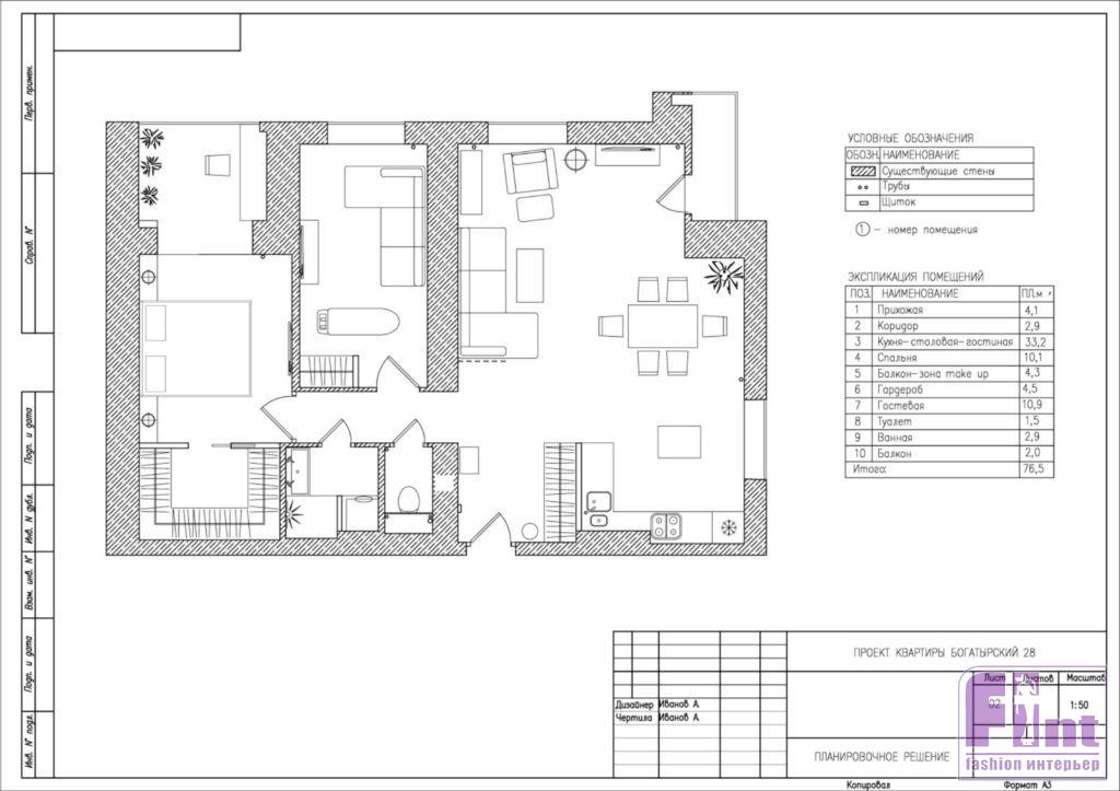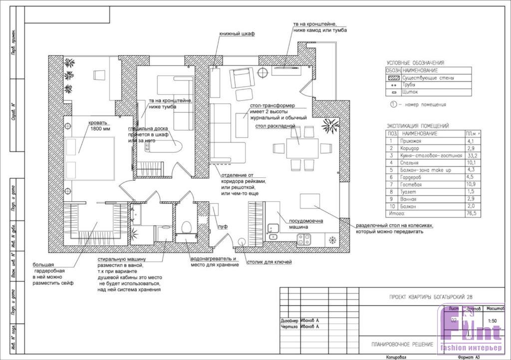 Квартиру поделили на зоны. Кухню объединили с гостиной и столовой, а гардероб вынесли в отдельное помещение, создав дополнительные системы хранения в коридоре. Системы хранения на кухне, в целях экономии пространства, располагаются до потолка. Коридор и гостиная разделены декоративной стеной из обработанных и декорированных деревянных реек, придающих вертикальную динамику небольшому по площади помещению коридора.