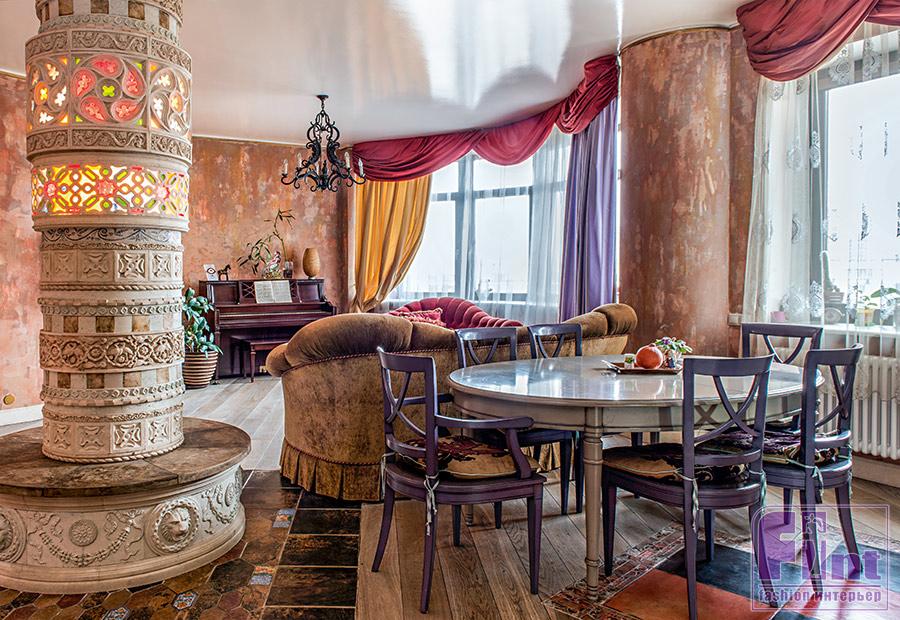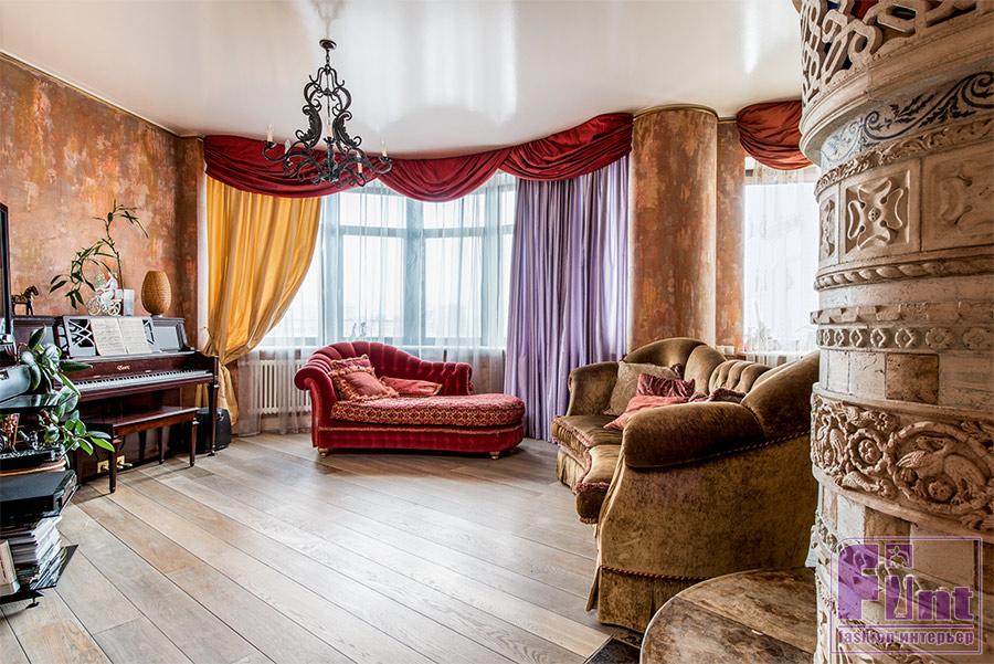 Мне хотелось классики, знойной, пряной, жгучей Италии, и она материализовалась. По замыслу, центр квартиры составляет единое пространство с холлом, гостиной, столовой и кухней. Тёмно-коричневая входная дверь будто изъедена жучками. Эркер оформлен яркими, оранжево-красно-сиреневыми шторами, которые великолепно преломляют солнечный свет.