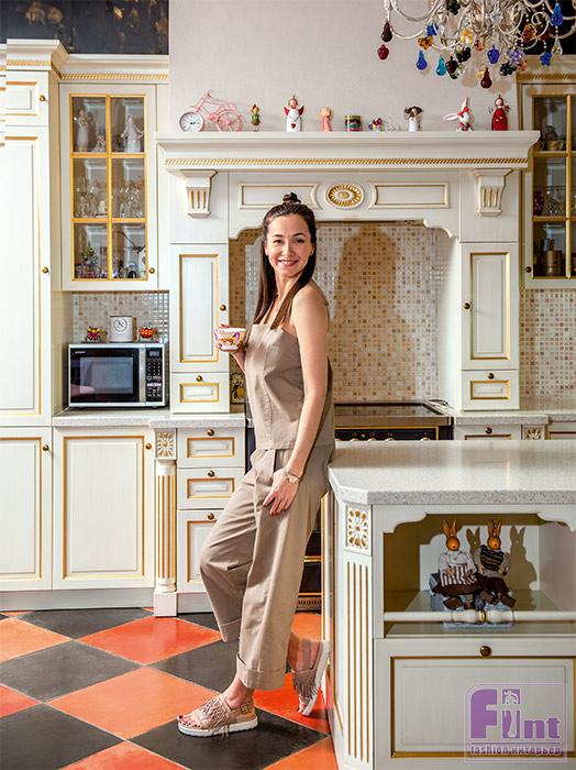 Кухонная зона небольшая, но тоже достаточно яркая: чёрно-золотые стены, на полу чёрно-красная плитка, люстра со стеклянными подвесками в виде фруктов. Гарнитур цвета слоновой кости с золотым декором, естественно, в классическом исполнении, с «островом». Столешницы сделаны из искусственного камня, «фартук» — из мозаики. Плиту я выбрала классического дизайна, но черную — для контраста. А картину с изображением одной из улиц Санкт-Петербурга мне подарил брат.