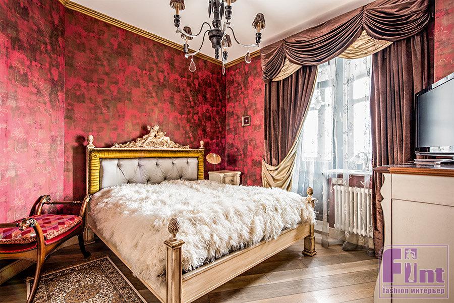 Просторная спальня хозяйки выполнена в богатой бордово-красной палитре. Центральное место занимает роскошная светлая кровать, изготовленная из натурального дерева. Изголовье кровати, отделанное тканью с эффектной «каретной стяжкой», прекрасно вписывается в классический интерьер спальни актрисы.
