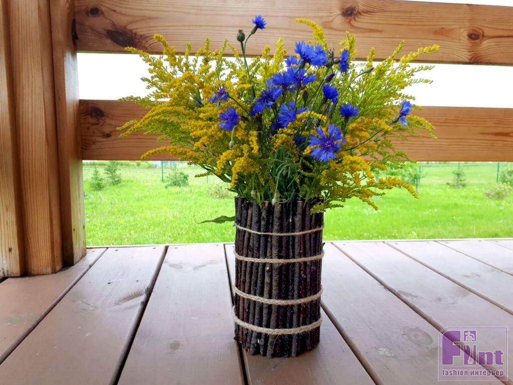 При желании эту вазочку можно украсить самым разнообразным природным декором: ягодами рябины, жёлудями, сухими листьями или цветами. Осталось собрать красивый букет из ярких полевых цветов и поставить в нашу вазу, которая станет настоящим украшением любого интерьера, придав ему стильные нотки натурального ЭКО стиля.