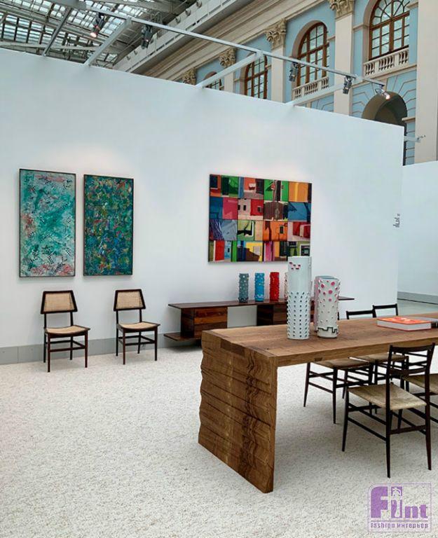 Консоль и светильники Ольги Тревас, абстракции Игоря Шелковского в экспозиции галерее «Палисандр» на выставке Cosmoscow