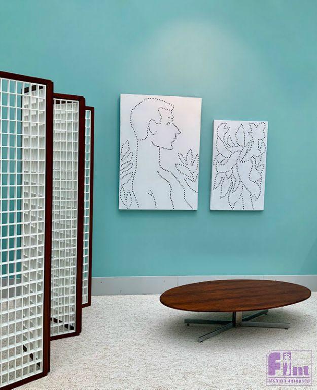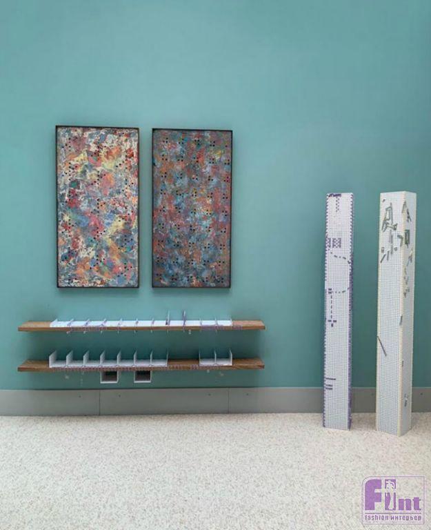 Консоль и светильники Ольги Тревас, абстракции Игоря Шелковского в экспозиции галерее «Палисандр» на выставке Cosmoscow