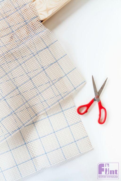 Измерьте ширину вашей кровати и обрежьте канву по этой ширине. Высоту куска канвы определите, исходя из вашего желания. Для нашего проекта мы соединили вместе два куска канвы, поскольку целого большого куска не нашлось. Для этого мы выровняли края двух кусков канвы и связали их вместе, используя прочный и тонкий шпагат.