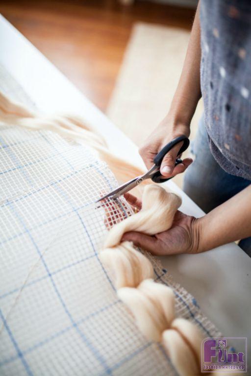 Выберите один клубок пряжи и аккуратно разделите волокна, развернув клубок в полоску пряжи. Отмотайте полоску по ширине изголовья с небольшим запасом и отрежьте нужный кусок. Аккуратно распушите шерсть, чтобы она имела примерно равную ширину по всей своей длине. Затем, используя ножницы, сделайте параллельные вертикальные надрезы в канве через равные промежутки. Ширина надрезов должна быть чуть меньше, чем ширина вашей пряжи.