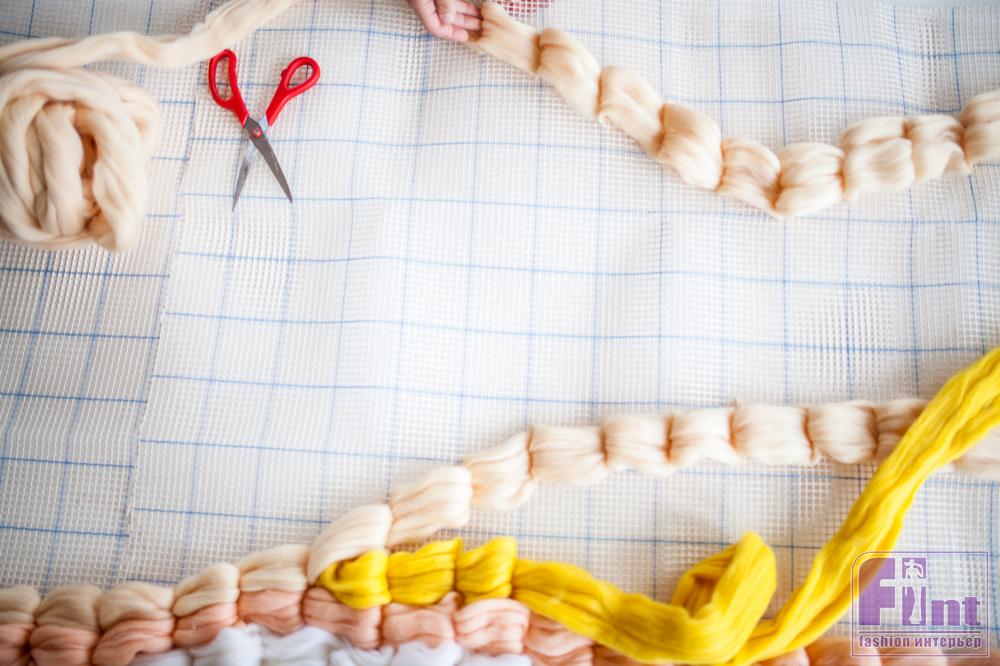 Продолжайте добавлять шерсть и ткать новые ряды в любом дизайне, который вам подходит. Оставляйте его монохромным, чередуйте свои цвета или примените свободную форму для плетения. Мы выбрали волнистые ряды из пряжи четырёх цветов, которые отлично подходят к существующей цветовой гамме нашего интерьера. Продолжайте добавлять «строки», изменяя цвета и узоры по своему усмотрению и заполняя любые пустые пространства дополнительными более короткими строками, пока вся канва не будет покрыта полосками пряжи.