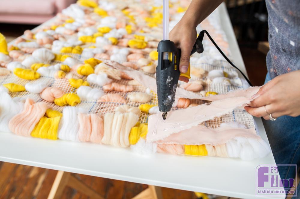 После того, как вы заполнили весь холст, сложите концы шерсти к изнаночной стороне канвы и используйте клей пистолет, чтобы закрепить их. Для дополнительной надёжности крепления и более аккуратных краёв приклейте полоску ткани шириной около 5 см поверх каждого ряда концов шерсти.
