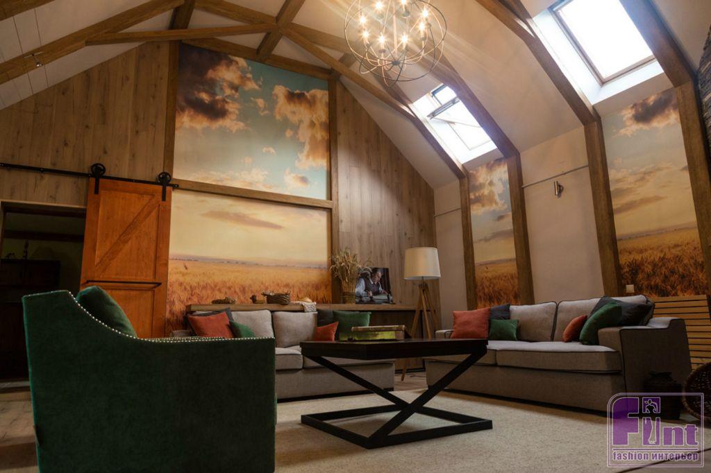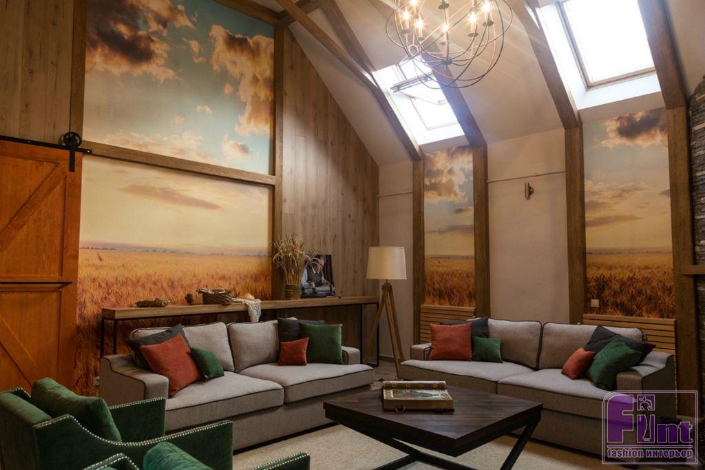 Главным интерьерным решением для гостиной Александра Балуева стали оригинальные фрески. Изображение представлено пейзажем – пшеничное поле и предзакатное небо с кучевыми облаками. Центральная фреска создаёт ощущение панорамного окна. Это цельное полотно 4,5 метра высотой, обрамленное деревянными балками. Остальные фрески меньшего размера размещены вертикально под окнами.