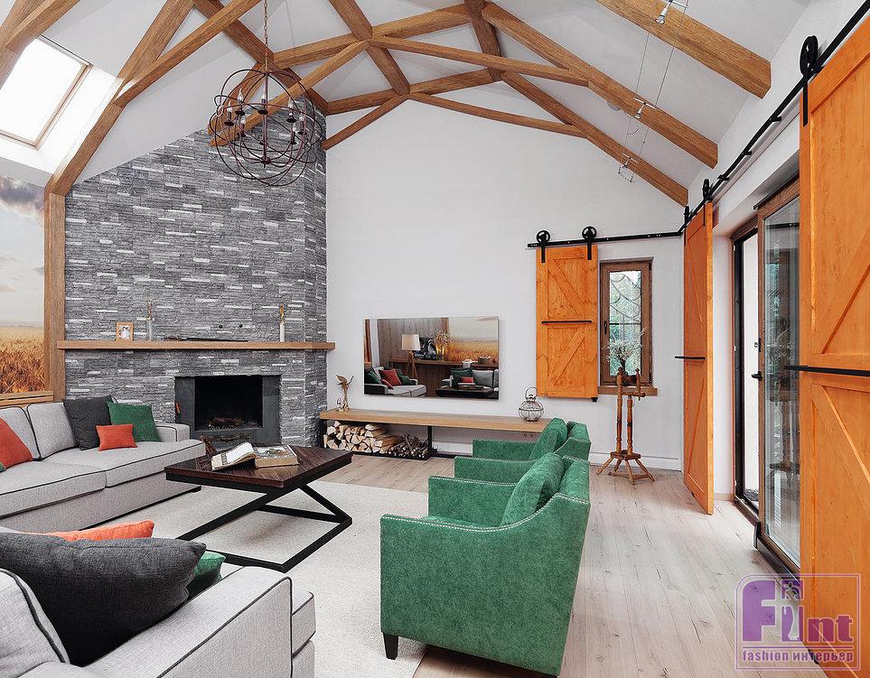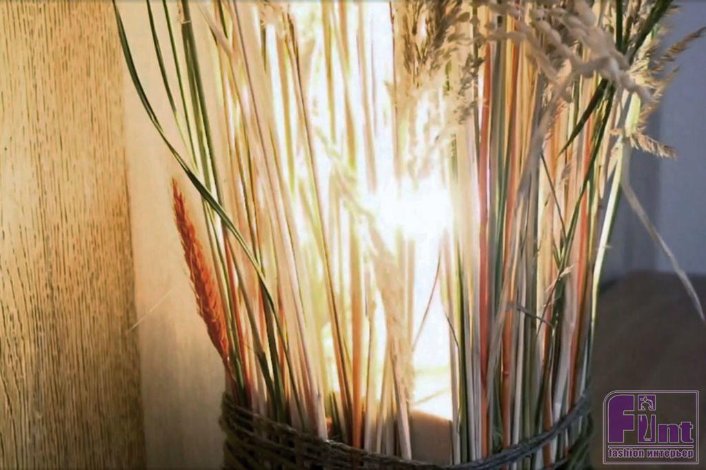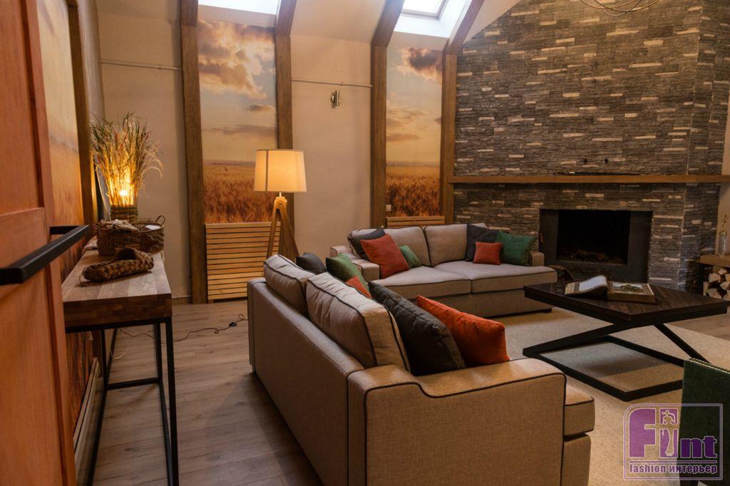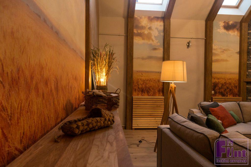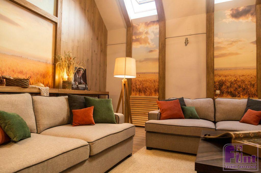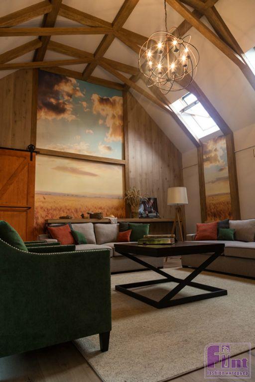 Гигантских размеров напольный ковёр с рисунком в виде плетёной соломки превосходно сочетается с романтическими мотивами фресок на стенах. Мягкий интерьерный свет создают авторские светильники, выдержанные в экостиле – лампочка спрятана в золотисто-зелёном снопе пшеницы и луговой травы. Кофейно-серые диваны в американском стиле акцентированы многочисленными подушками зелёного, оранжевого и шоколадного цвета. В центре гостиной установлен журнальный столик замысловатой геометрической формы.